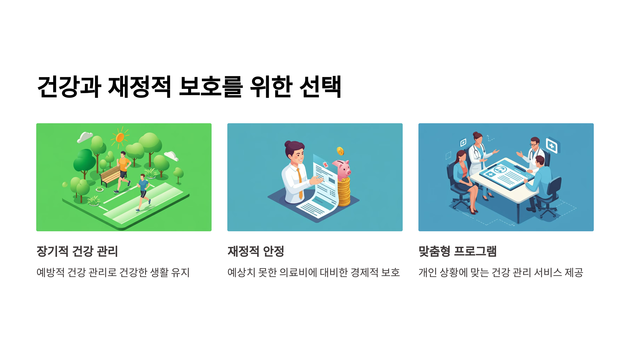 단순한 의료비 보장을 넘어, 건강 증진을 위해 예방적인 건강 관리와 생활 습관 개선 프로그램을 제공하며, 가입자가 장기적으로 건강을 유지하도록 돕습니다.