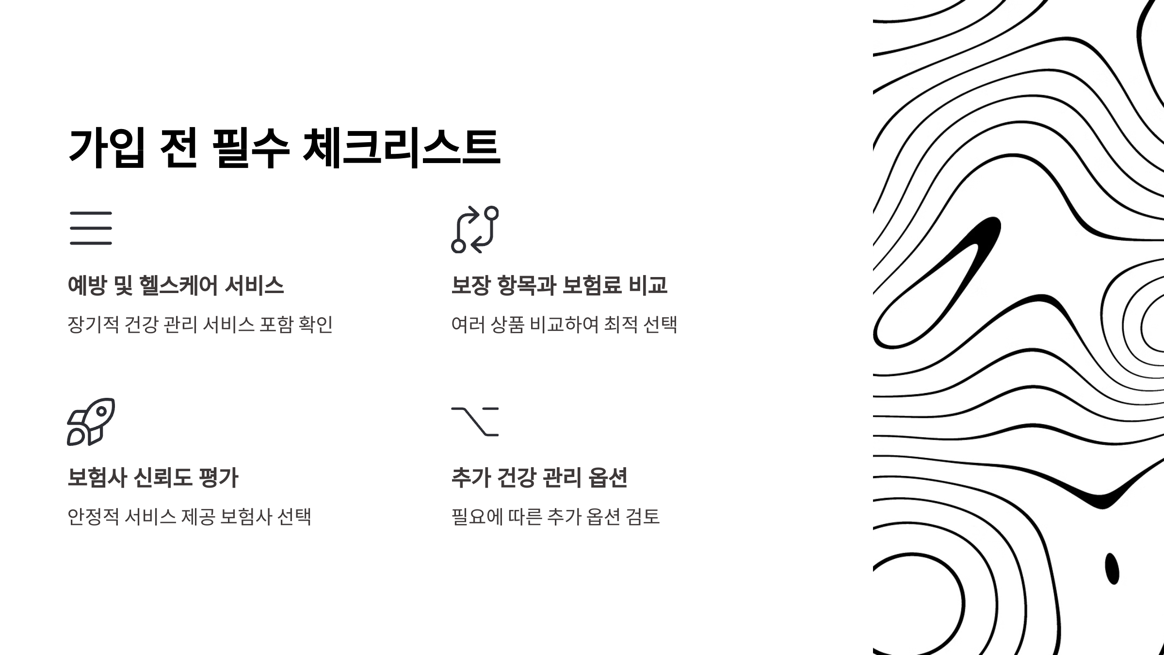 이 가이드를 통해 건강관리형 보험의 주요 보장 항목과 가입 절차를 이해하고, 가입 전 체크리스트를 활용하여 본인에게 적합한 보험을 선택할 수 있습니다.