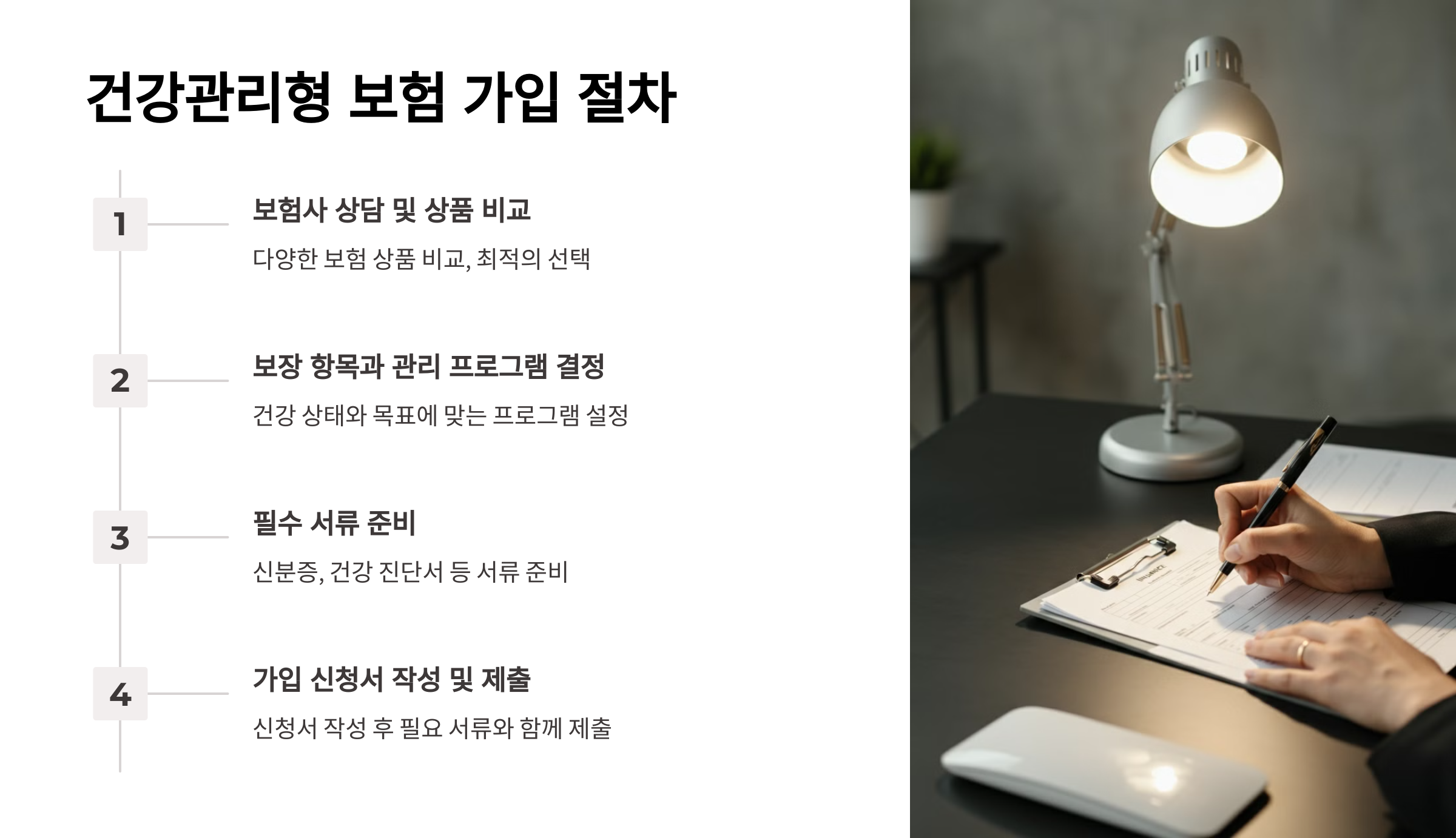 건강관리형 보험 가입 절차는 크게 상담 및 상품 비교, 보장 항목과 관리 프로그램 결정, 필수 서류 준비, 그리고 신청서 작성 및 제출로 이루어집니다. 보험사의 다양한 상품을 비교하고 본인의 건강 상태와 목표에 맞는 상품을 선택하는 것이 중요합니다.