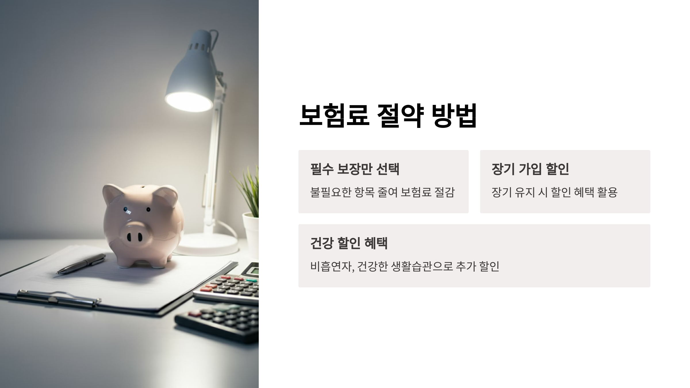 보험료 절약을 위해 본인에게 꼭 필요한 보장만 선택하고, 장기 가입 할인 혜택, 비흡연자 및 건강 상태에 따른 할인 혜택을 활용할 수 있습니다. 또한 불필요한 특약을 생략하여 보험료 부담을 줄일 수 있습니다.