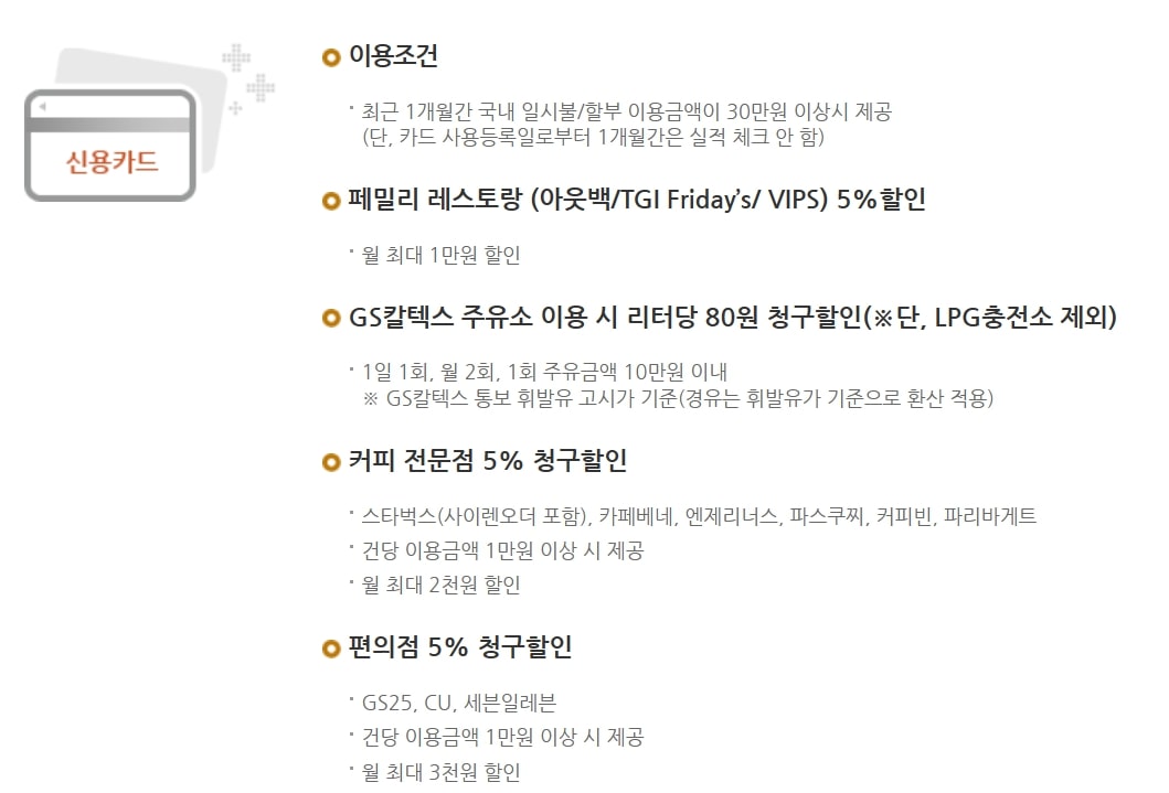 - 주유소 할인: GS칼텍스 주유소 이용 시 리터당 80원 할인
