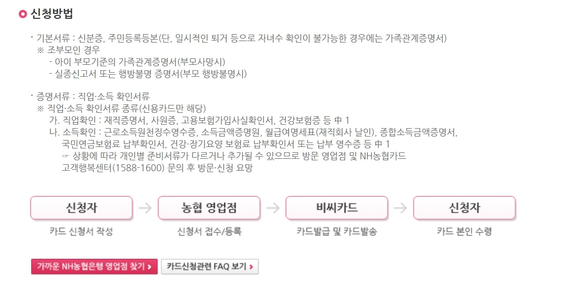 | 신청 방법 | 1. 농협 영업점 방문 및 신청서 작성 2. NH농협카드 고객행복센터(1588-1600) 문의 3. 필요 서류 제출 4. 카드 발급 및 수령 |