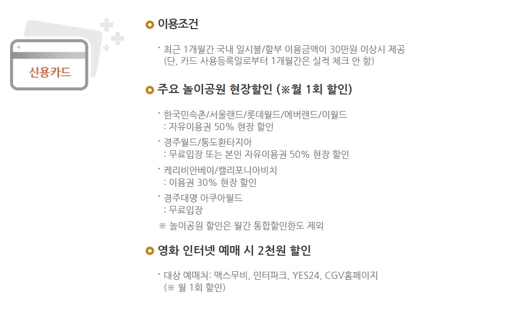 주요 혜택 주유소, 커피 전문점, 백화점 및 대형할인점, 온라인 쇼핑몰,