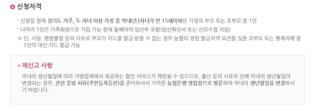 카드 발급 대상은 경기도에 주소를 두고 막내 자녀가 만 15세 이하인 2자녀 이상 가정의 부모 또는 조부모 중 1인입니다. 발급을 원하시면 가까운 농협은행에 방문하셔서 신청하실 수 있으며, 필요한 서류로는 신분증과 주민등록등본이 필요합니다.
