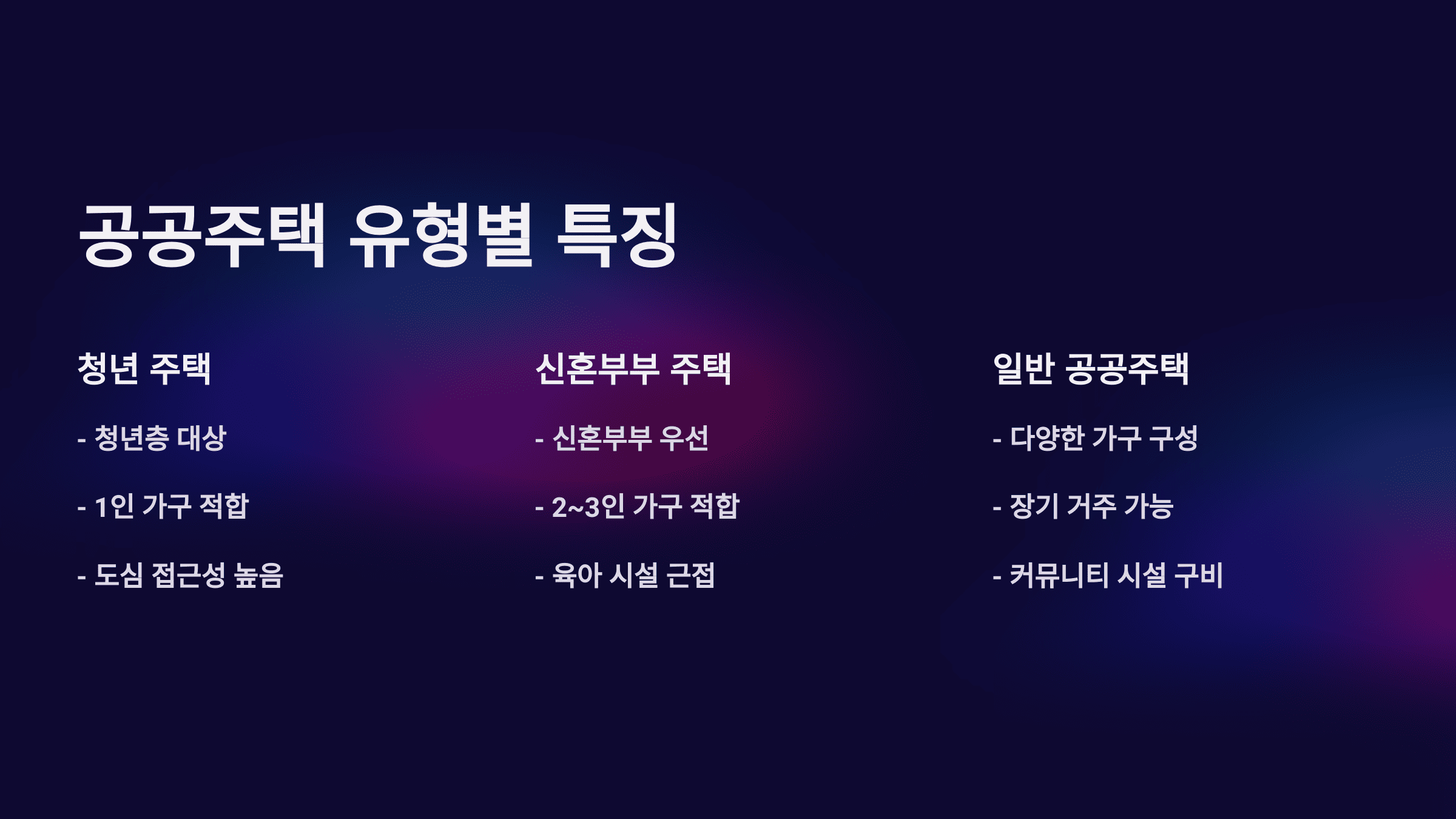 주거 안정은 개인과 가구의 삶의 질을 높이는 데 필수적인 요소입니다. 공공주택은 이러한 안정을 지원하며, 사회 전반의 행복도를 증진합니다. - 청년층 및 신혼부부 지원