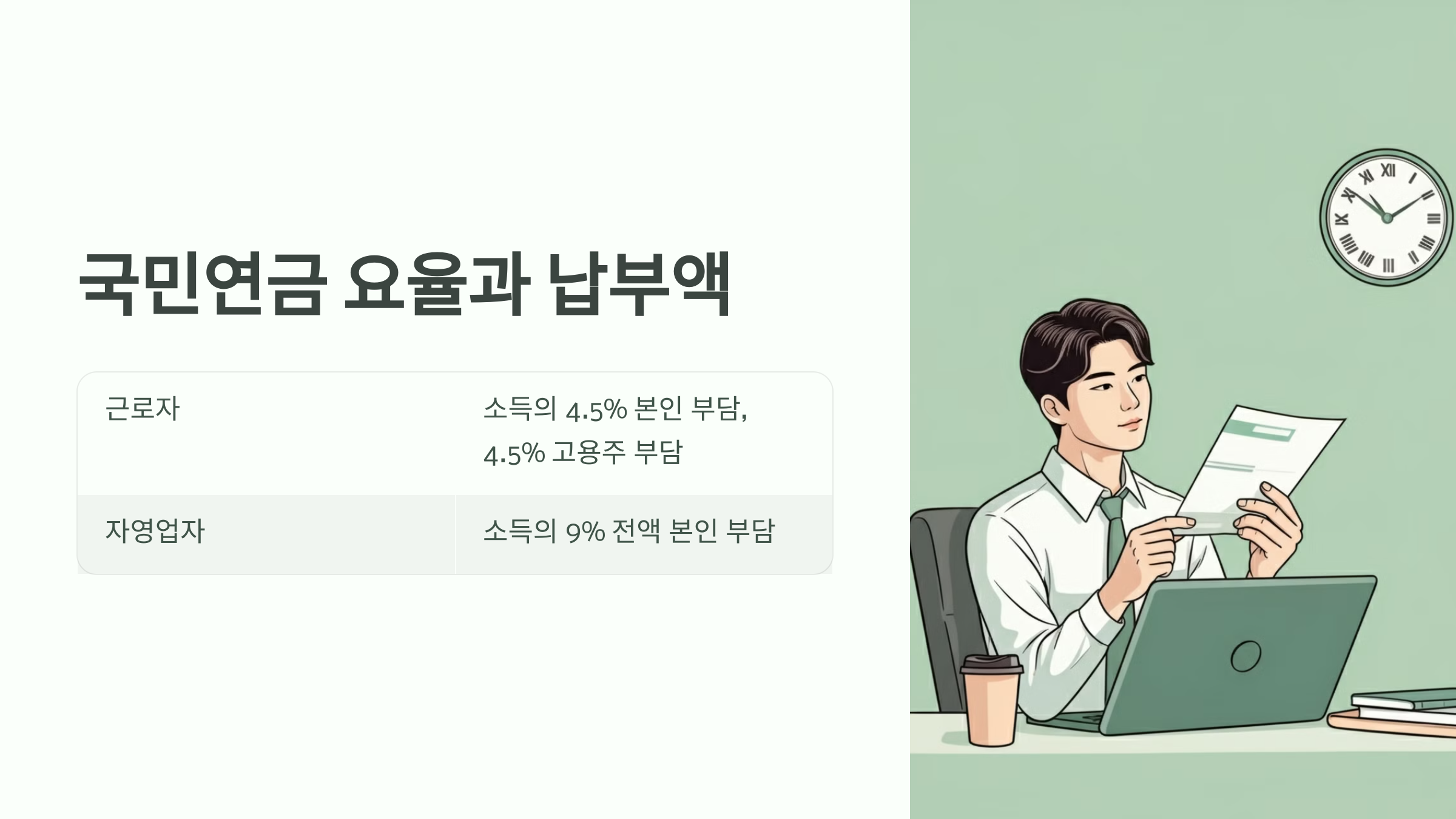- 자영업자: 자영업자는 고용주가 없으므로 본인이 소득의 9%를 전액 부담합니다. 자영업자의 경우 소득 변동이 있을 수 있지만, 매달 기본 요율에 맞춰 일정 금액을 납부하게 됩니다.