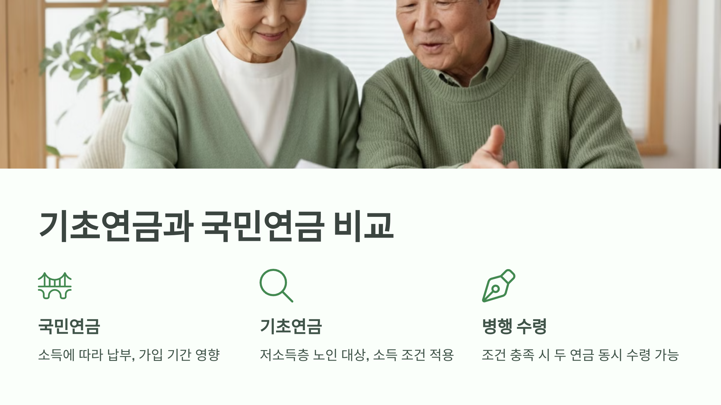 국민연금과 달리 소득에 따라 기초연금의 수급 여부가 결정되며, 국민연금을 받고 있는 경우라도 소득 조건에 따라 기초연금을 추가로 받을 수 있습니다.