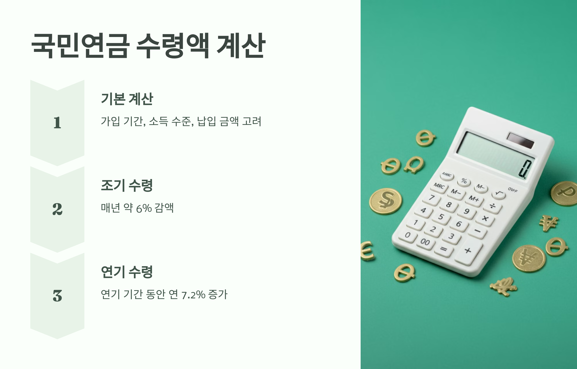 - 연기 수령: 반대로 연금 수령을 만 65세 이후로 연기하면 수령액이 증가하게 됩니다. 수령 연기를 선택할 경우, 연기 기간에 따라 매년 약 7.2%의 추가 혜택이 제공되며, 최대 70세까지 연기할 수 있습니다. 예를 들어, 수령을 70세까지 연기하면 연금 수령액이 약 36% 증가합니다.