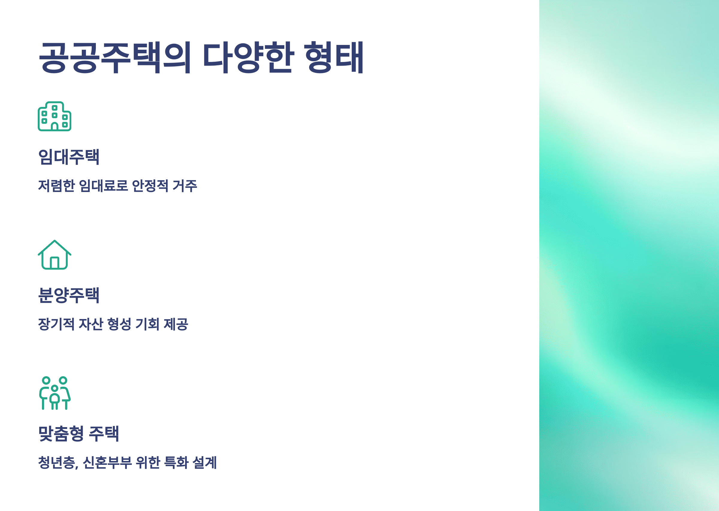 공공주택은 임대주택, 분양주택 등 다양한 형태로 제공됩니다. 이는 다양한 주거 수요를 충족시키기 위한 것으로, 서민과 청년층이 안정적인 주거 환경을 누릴 수 있도록 돕습니다.