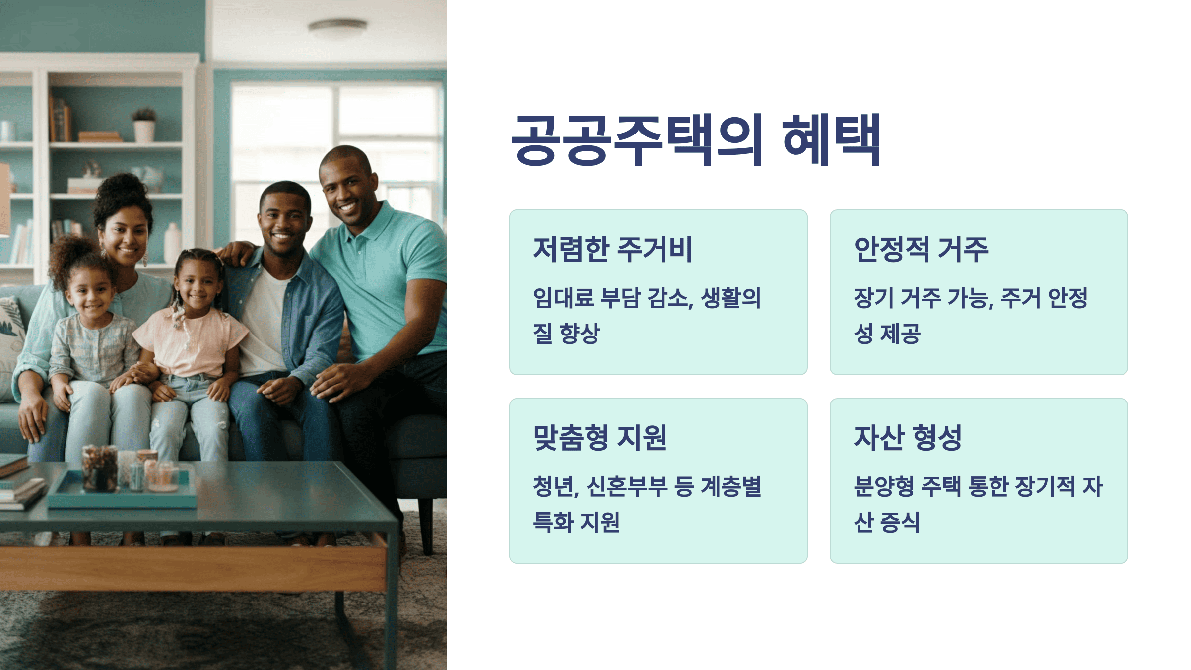 공공주택은 저렴한 임대료와 안정적인 거주 환경을 제공합니다. 이는 저소득층과 청년층, 신혼부부 등 다양한 계층이 안정적인 주거 환경을 누릴 수 있도록 돕습니다.