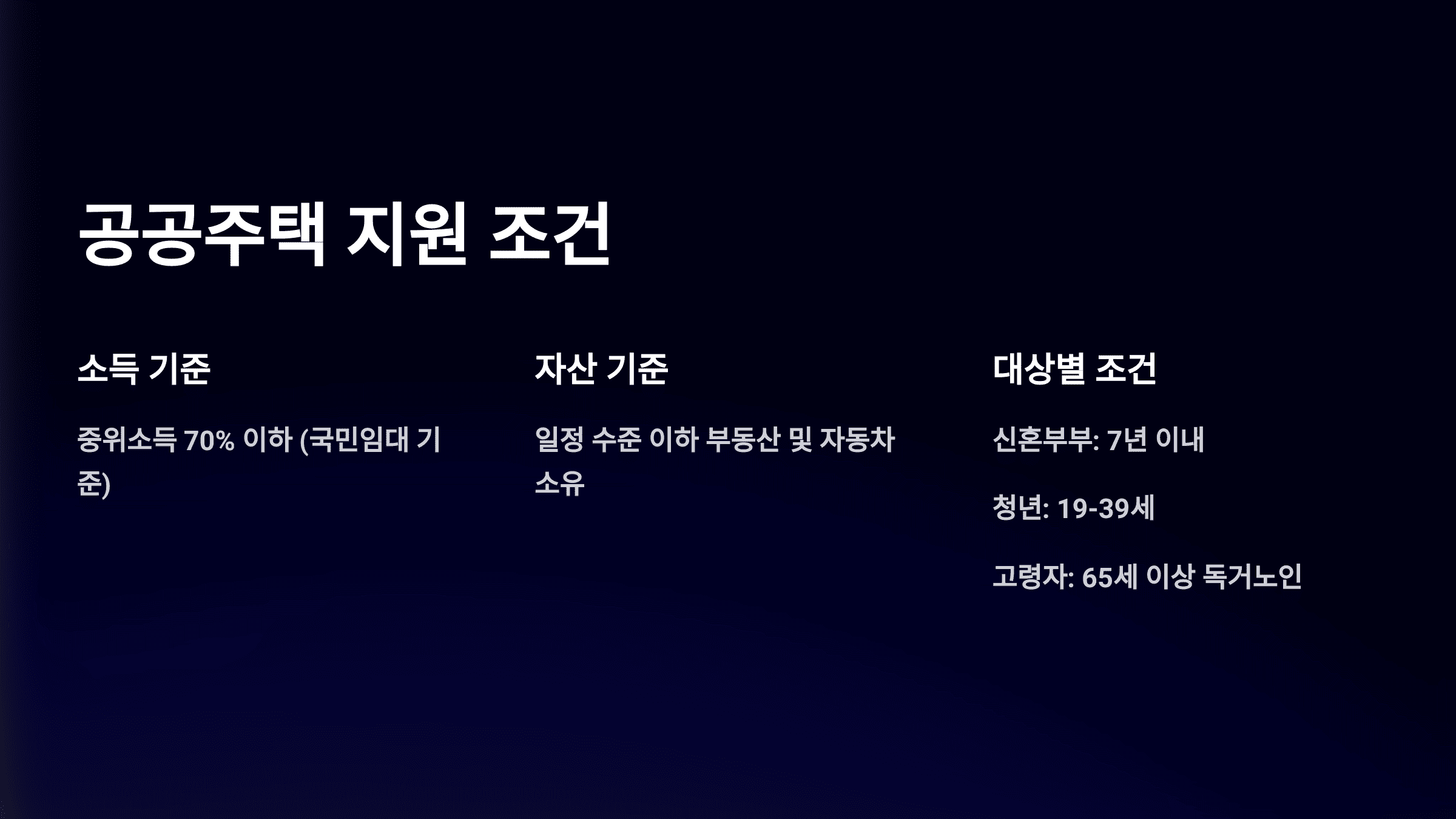공공주택 지원 조건은 신청자의 소득 수준, 자산 규모, 가구 형태 등을 종합적으로 고려해 설정됩니다. 이는 신청자의 경제적 취약성을 평가해 공정한 지원이 이루어지도록 하기 위함입니다.