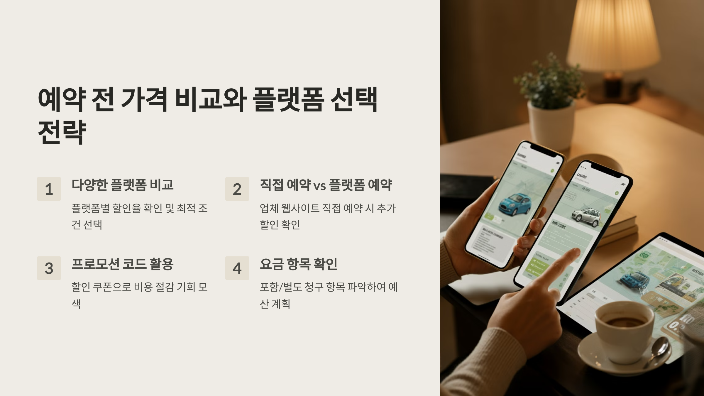 합리적인 가격에 렌터카를 이용하기 위해서는 다양한 플랫폼을 통해 가격을 비교하는 것이 필수적입니다. 여기에 각 플랫폼에서 제공하는 혜택이나 요금 정책을 확인하고 최적의 조건을 선택하는 것이 중요합니다.