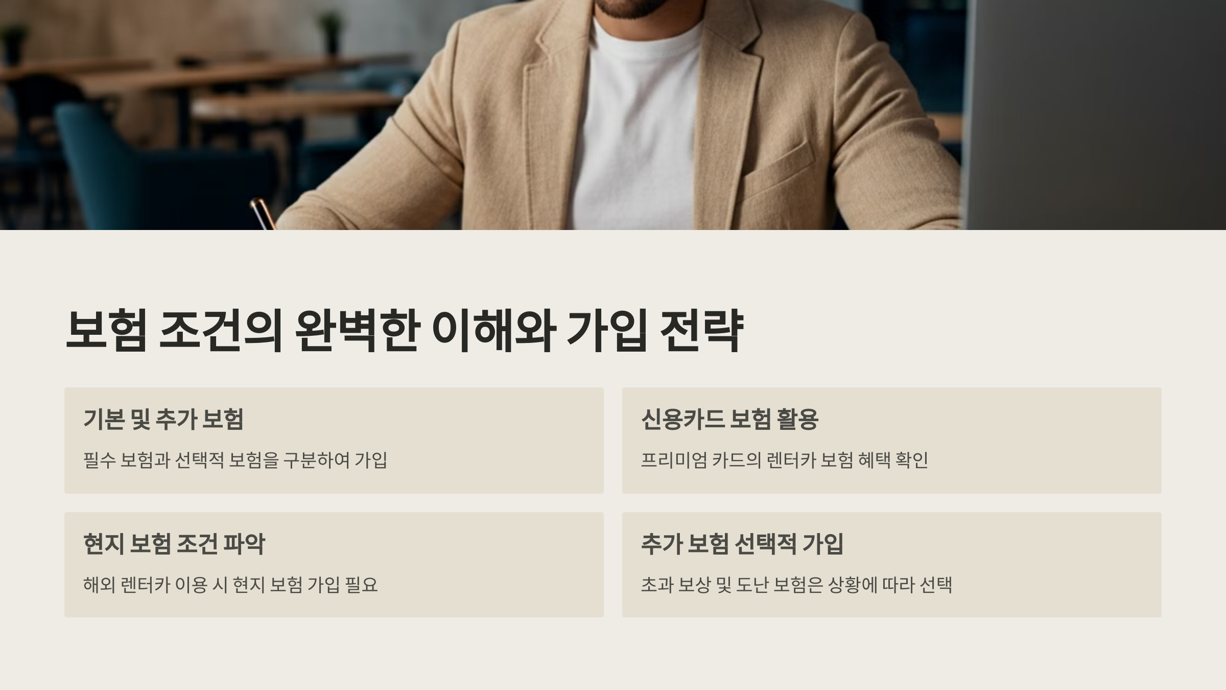 - 신용카드 보험 활용 가능 여부 확인: 프리미엄 신용카드는 렌터카 보험 혜택을 포함하는 경우가 많습니다. 카드사에서 제공하는 보험 혜택을 활용하면 추가 보험 가입 없이도 혜택을 받을 수 있어 경제적입니다. 사전에 카드사에 문의해 혜택을 확인해보세요.