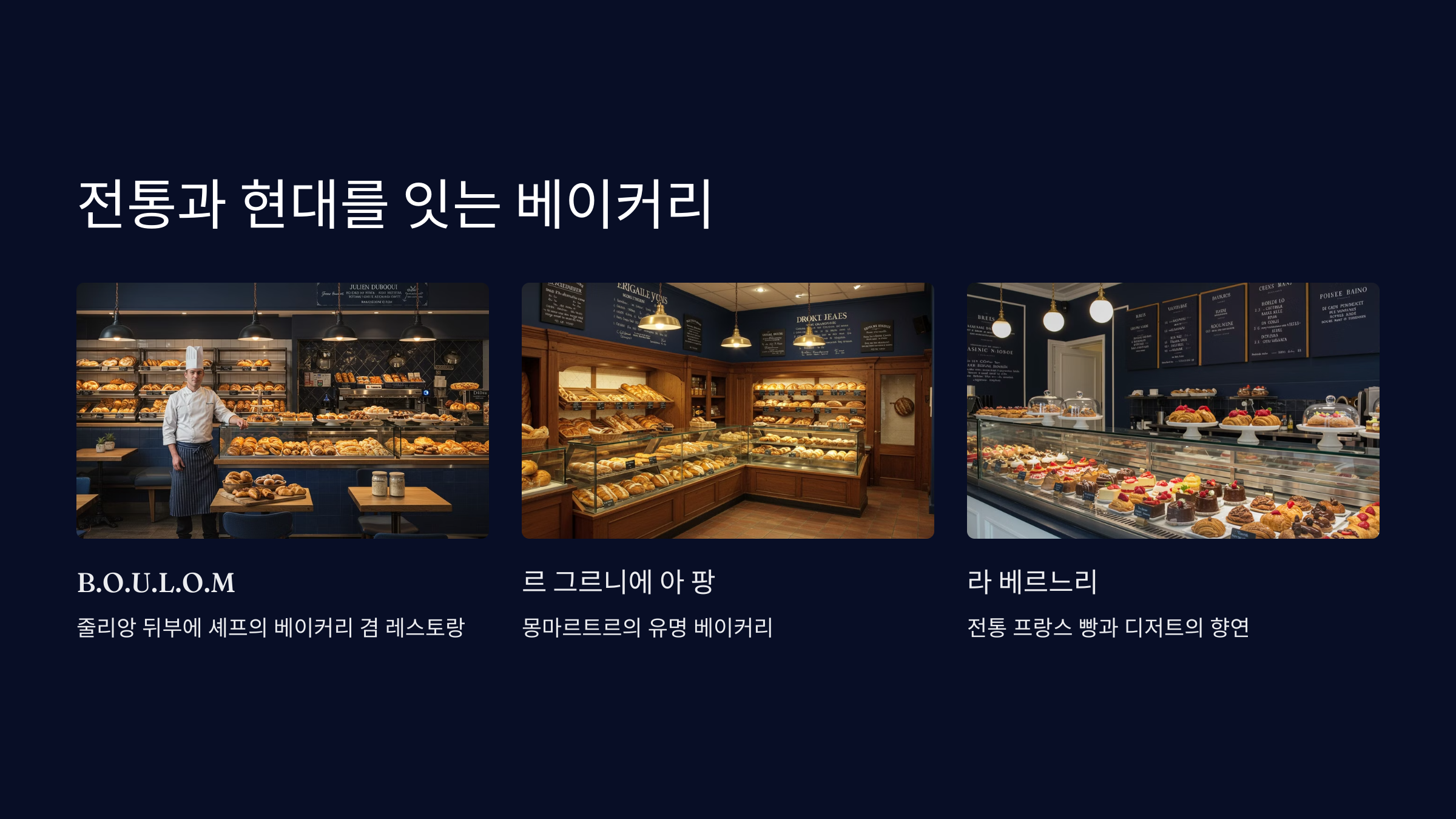 | 전통 베이커리 | 바게트, 크루아상 같은 프랑스 전통 빵을 판매하는 곳 많음 |