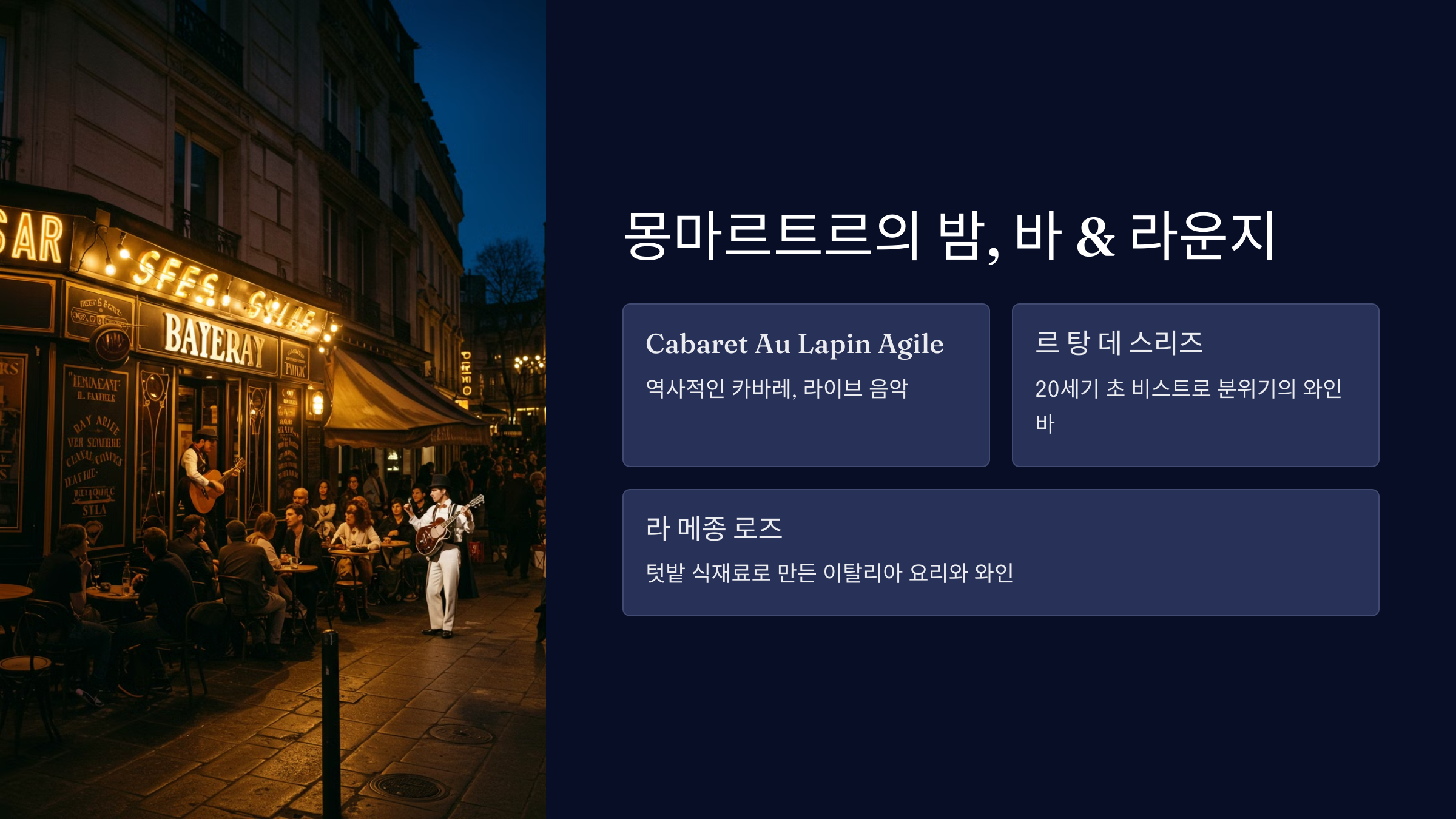 몽마르트르의 밤은 낮과는 또 다른 매력을 지니고 있어요. 예술과 낭만이 가득한 이곳에서 칵테일을 즐기거나 와인 한 잔을 기울일 수 있는 멋진 바와 라운지가 많이 있답니다.