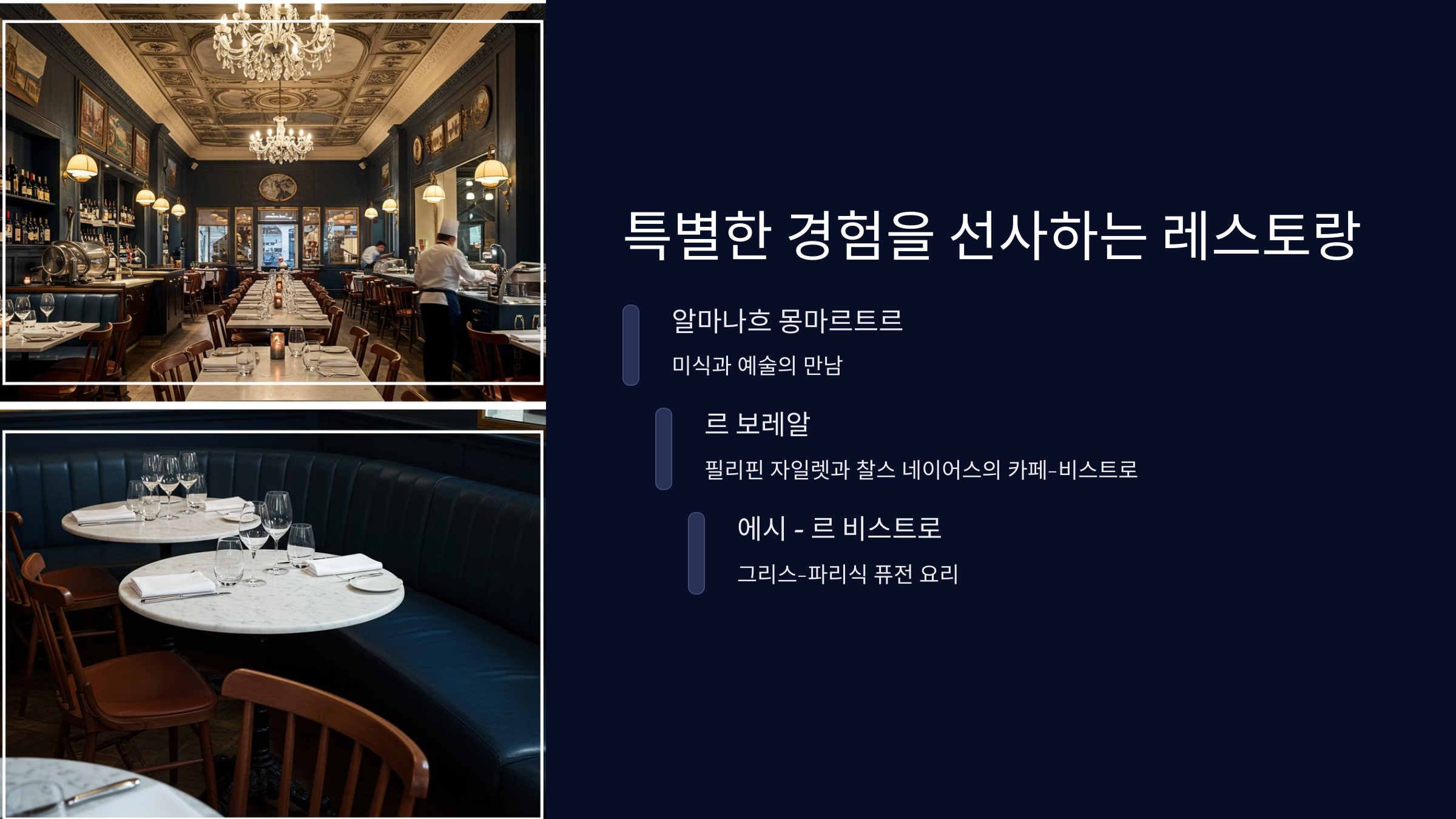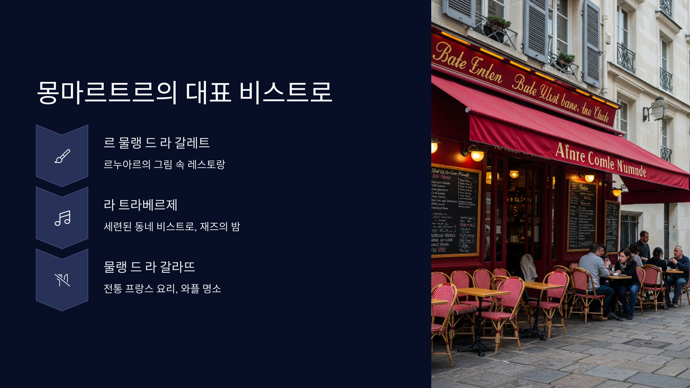 몽마르트르의 비스트로는 작은 규모지만 프랑스 요리의 매력을 제대로 느낄 수 있는 곳들이 많아요. 특히, 비스트로는 정식 레스토랑보다는 좀 더 캐주얼한 분위기에서 식사를 즐길 수 있도록 구성된 곳이죠.