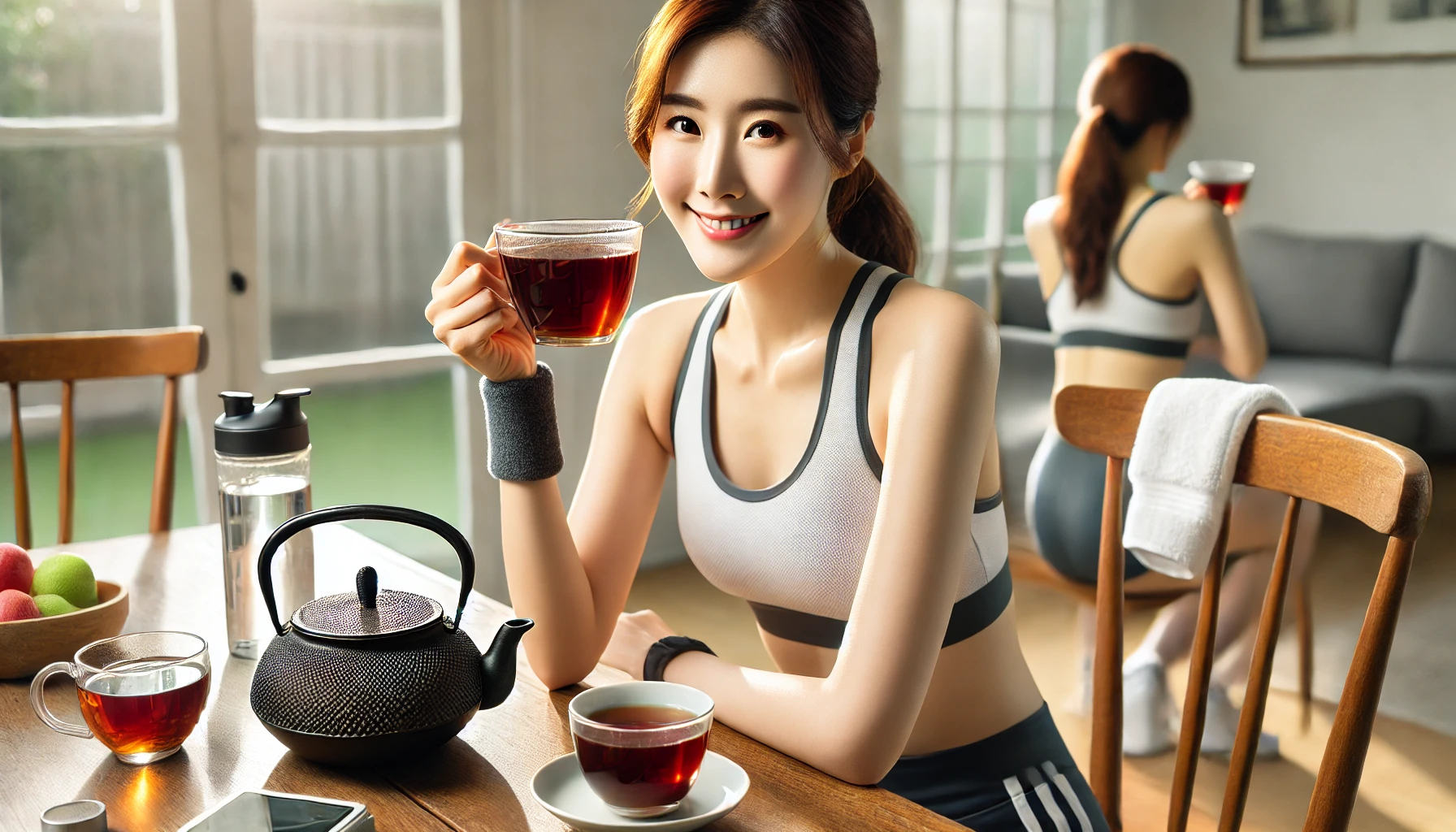 보이차-다이어트-아시아-여성-운동-후-차-마시는-모습