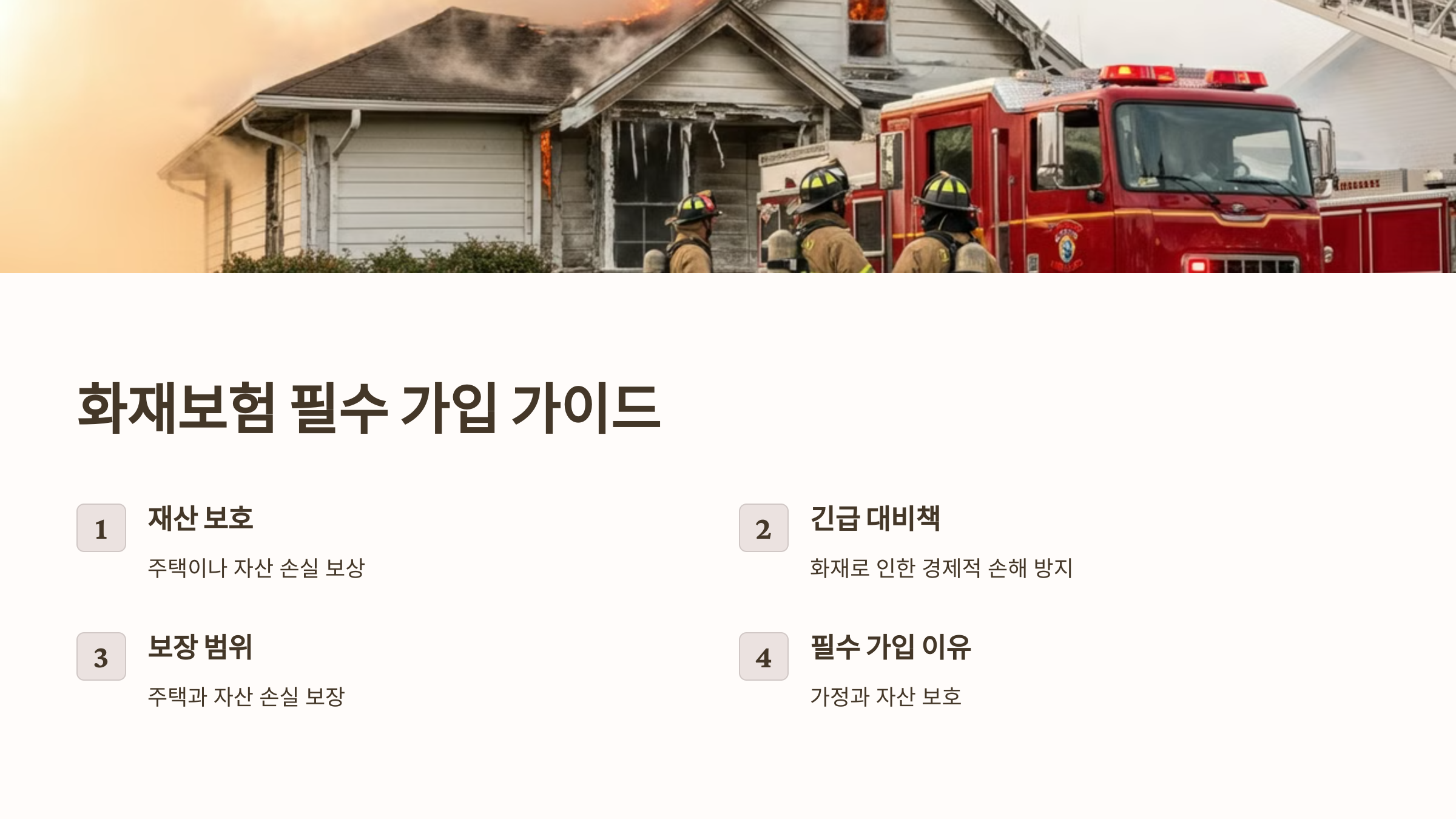 - 필수 가입 이유: 화재보험을 통해 가정과 자산을 보호할 수 있으며, 갑작스러운 화재 피해에 대비할 수 있습니다.