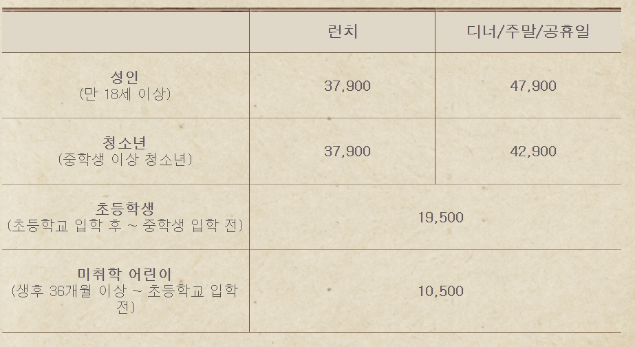 평일 16시 이후에는 디너 요금이 적용되므로, 점심 시간에 방문하시면 더 저렴하게 샐러드 바를 즐길 수 있습니다. 또한, 성인과 청소년은 평일 런치와 디너, 주말, 공휴일에 따라 가격이 다르므로, 방문 전에 확인하시기 바랍니다. 초등학생과 미취학 어린이는 평일 런치, 디너, 주말, 공휴일 모두 같은 가격입니다. 36개월 미만의 아이들은 무료로 샐러드 바를 이용할 수 있습니다.