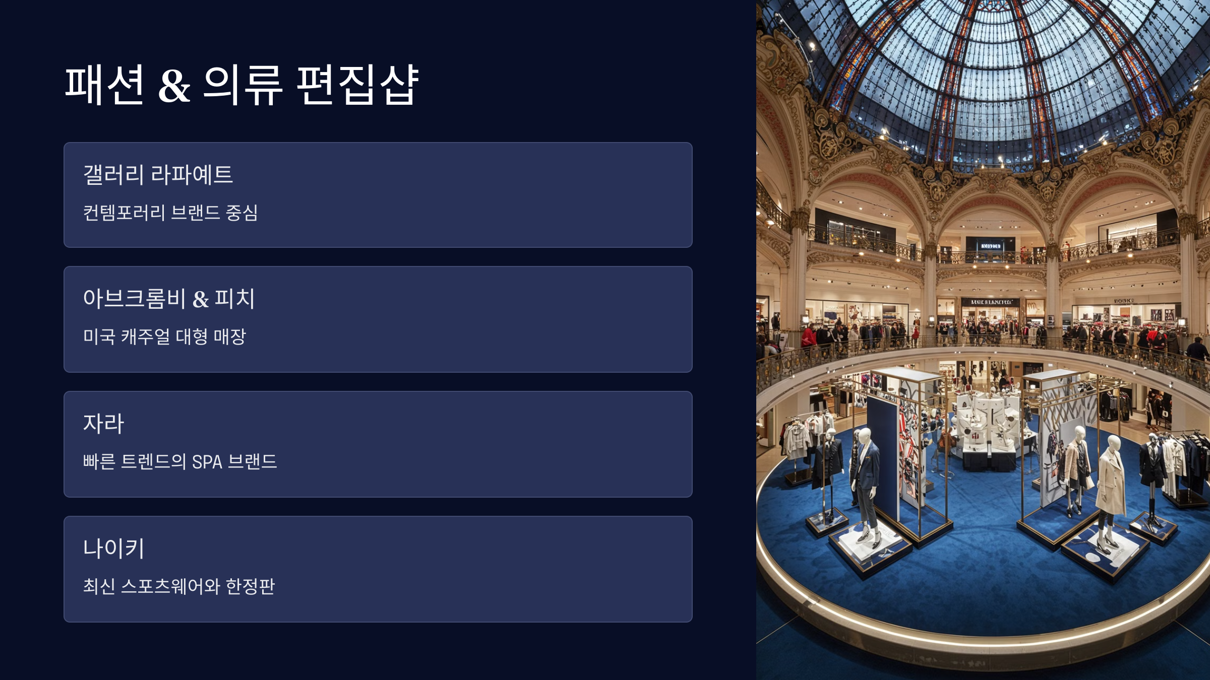 갤러리 라파예트 (La Galerie Lafayette) 50 Avenue des Champs-Élysées 다양한 브랜드, 최신 패션 트렌드