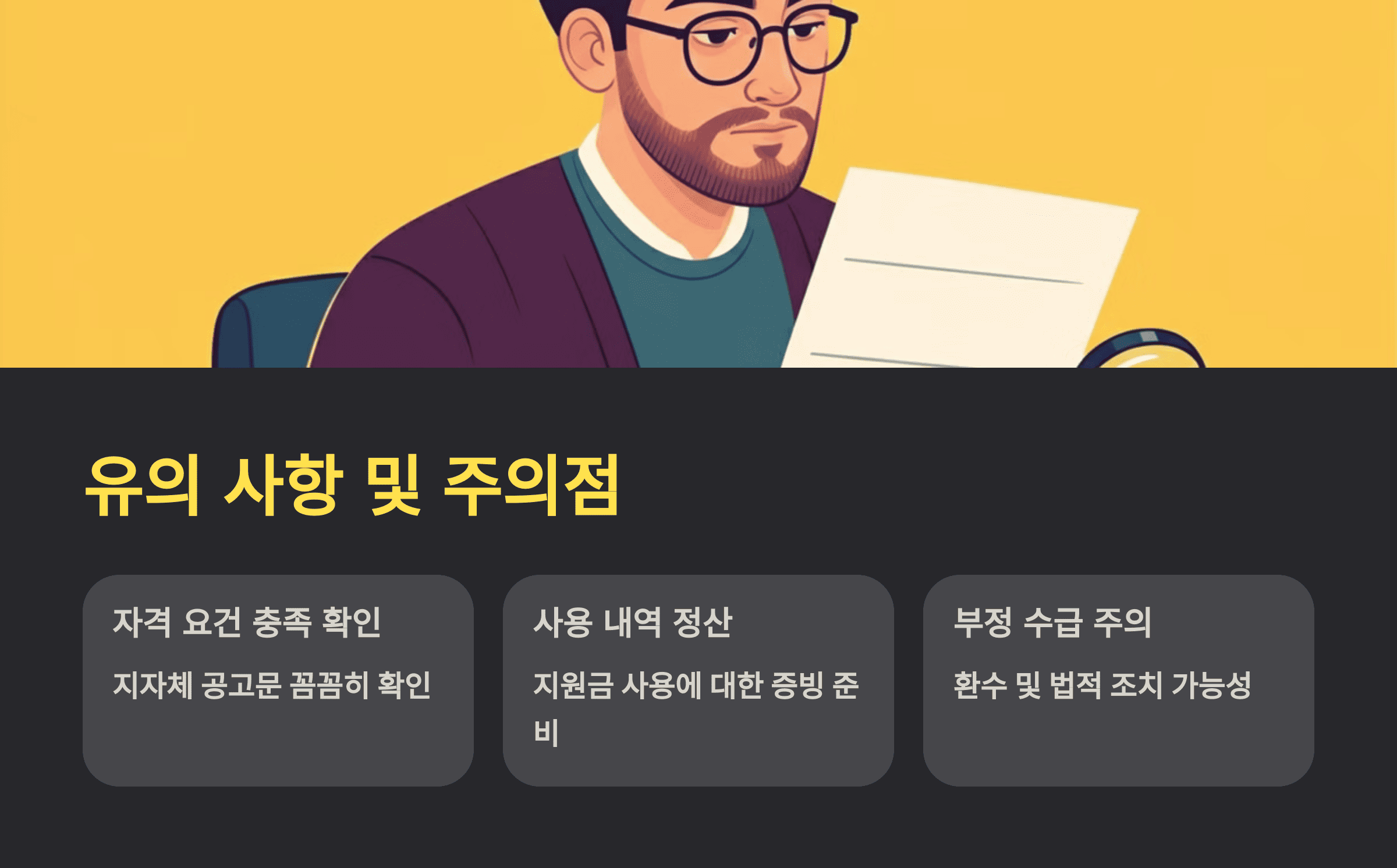 지자체의 특정 요건에 따라 신청 조건이 다를 수 있으므로 지역별 공고를 반드시 확인하세요. 허위 정보 제출 시 지원금 회수 및 추가 불이익이 있을 수 있으니 주의가 필요합니다.