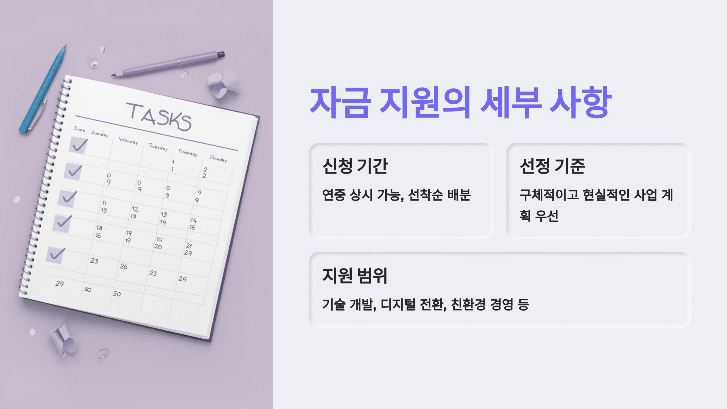 지원되는 자금은 기술 개발, 디지털 전환, 친환경 경영 등 미래 성장 동력을 확보하기 위해 사용됩니다. 이를 통해 소상공인들은 최신 기술을 도입하고, 디지털 전환을 통해 효율성을 높이며, 친환경 경영을 실천할 수 있게 됩니다. 이러한 변화는 소상공인들의 경쟁력을 강화하는 데 큰 도움이 될 것입니다.