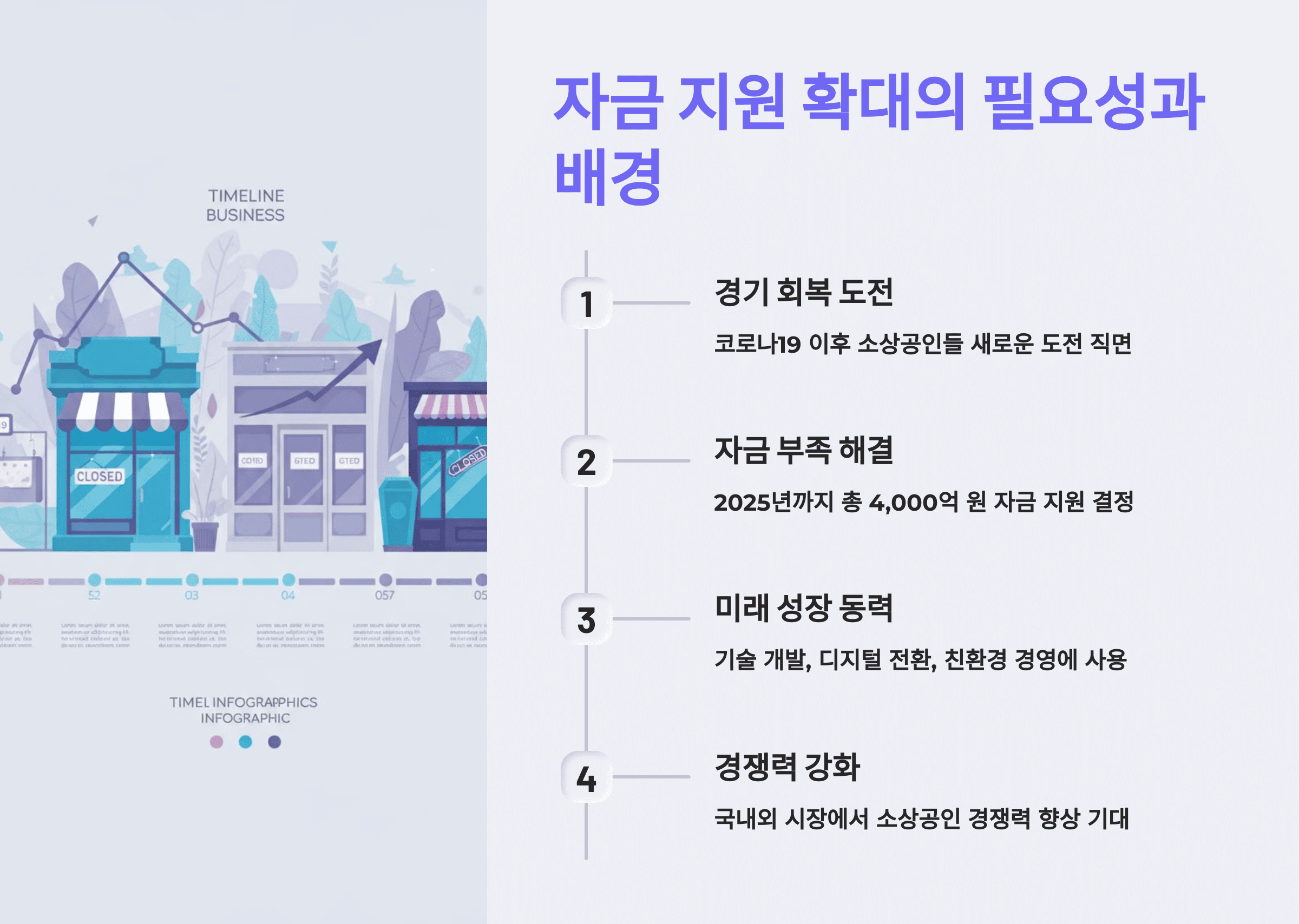 정부는 소상공인들의 자금 부족 문제를 해결하기 위해 2025년까지 총 4,000억 원의 자금을 지원하기로 결정했습니다. 이는 소상공인들이 안정적으로 사업을 운영하고, 성장할 수 있도록 돕기 위한 중요한 조치입니다.