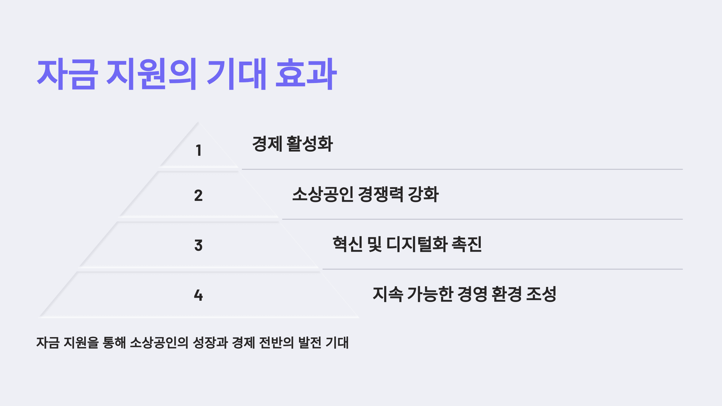 이 지원은 소상공인이 국내외 시장에서 경쟁력을 높이는 데 크게 기여할 것으로 기대됩니다. 자금 지원을 통해 소상공인들은 더 나은 제품과 서비스를 제공할 수 있으며, 이를 통해 국내외 시장에서의 입지를 강화할 수 있습니다.