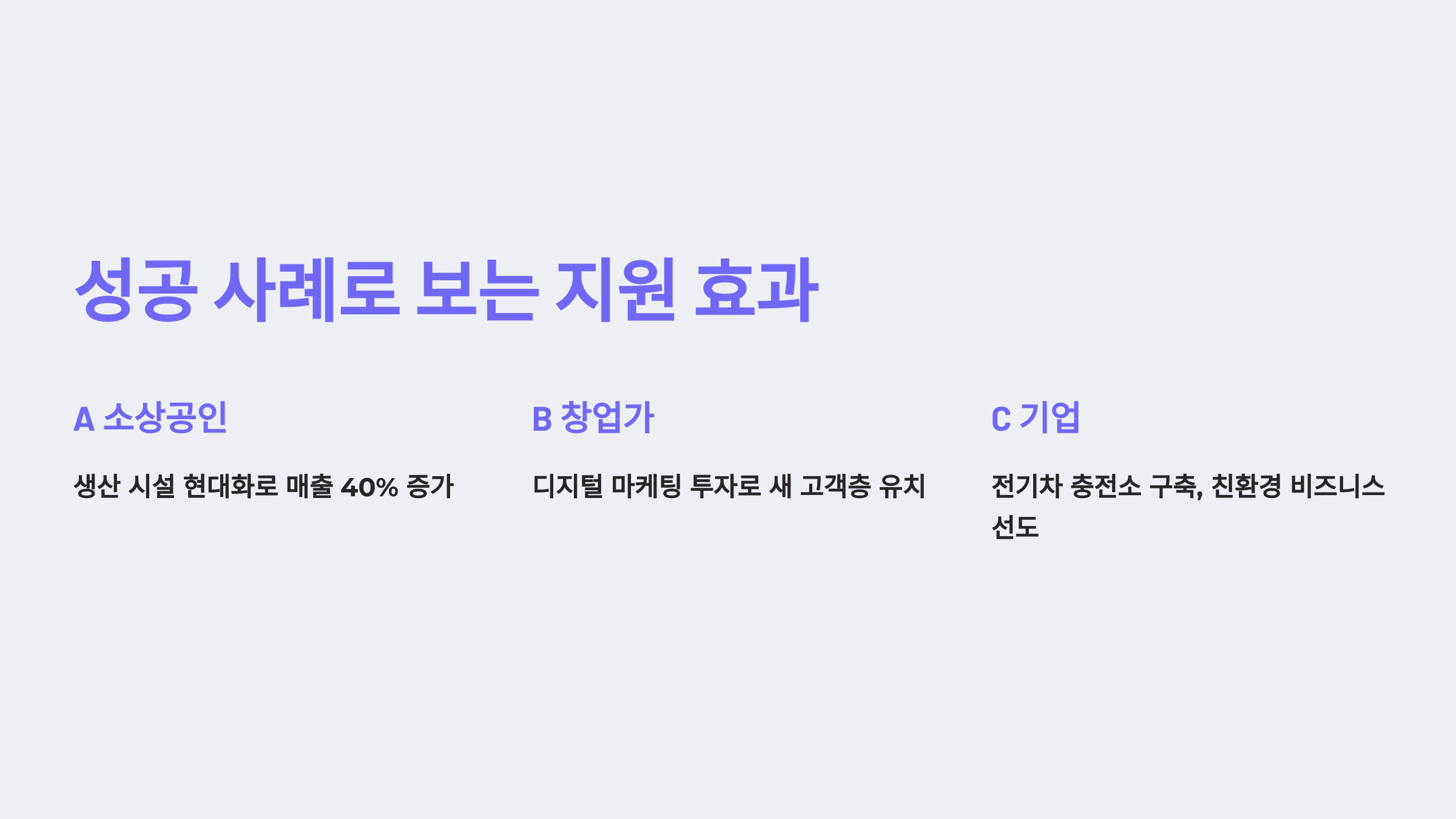 A 소상공인은 스케일업 자금을 통해 생산 시설을 현대화하여 매출이 40% 증가했습니다. 이 자금을 활용하여 최신 기술과 장비를 도입함으로써 생산 효율성을 크게 향상시켰습니다. 이를 통해 제품의 품질과 생산 속도가 개선되어, 고객 만족도와 매출이 동시에 증가하는 성과를 거두었습니다.