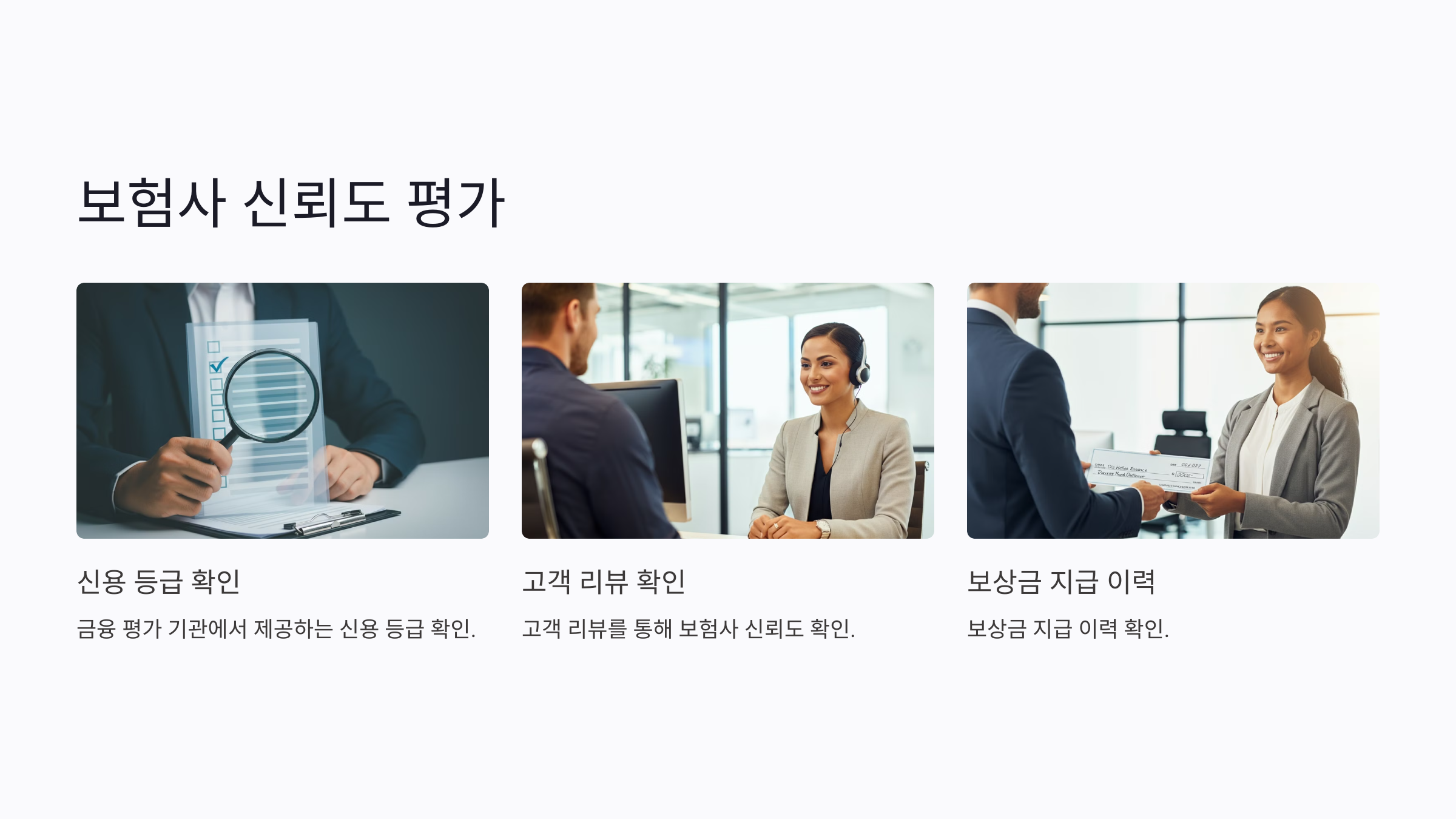 금융 평가 기관에서 제공하는 보험사 신용 등급이나 고객 리뷰 등을 통해 신뢰할 수 있는 보험사를 선택하세요.