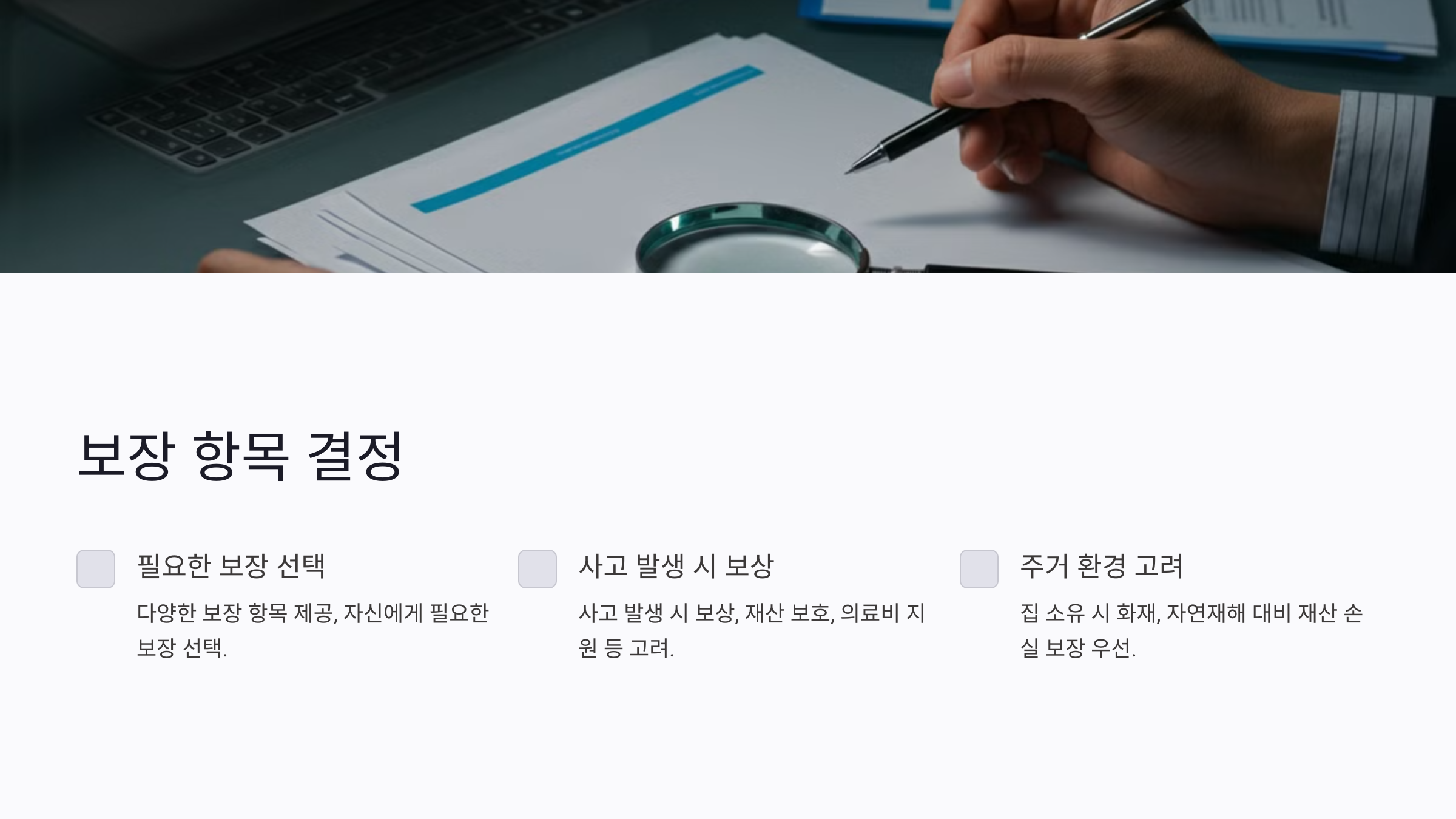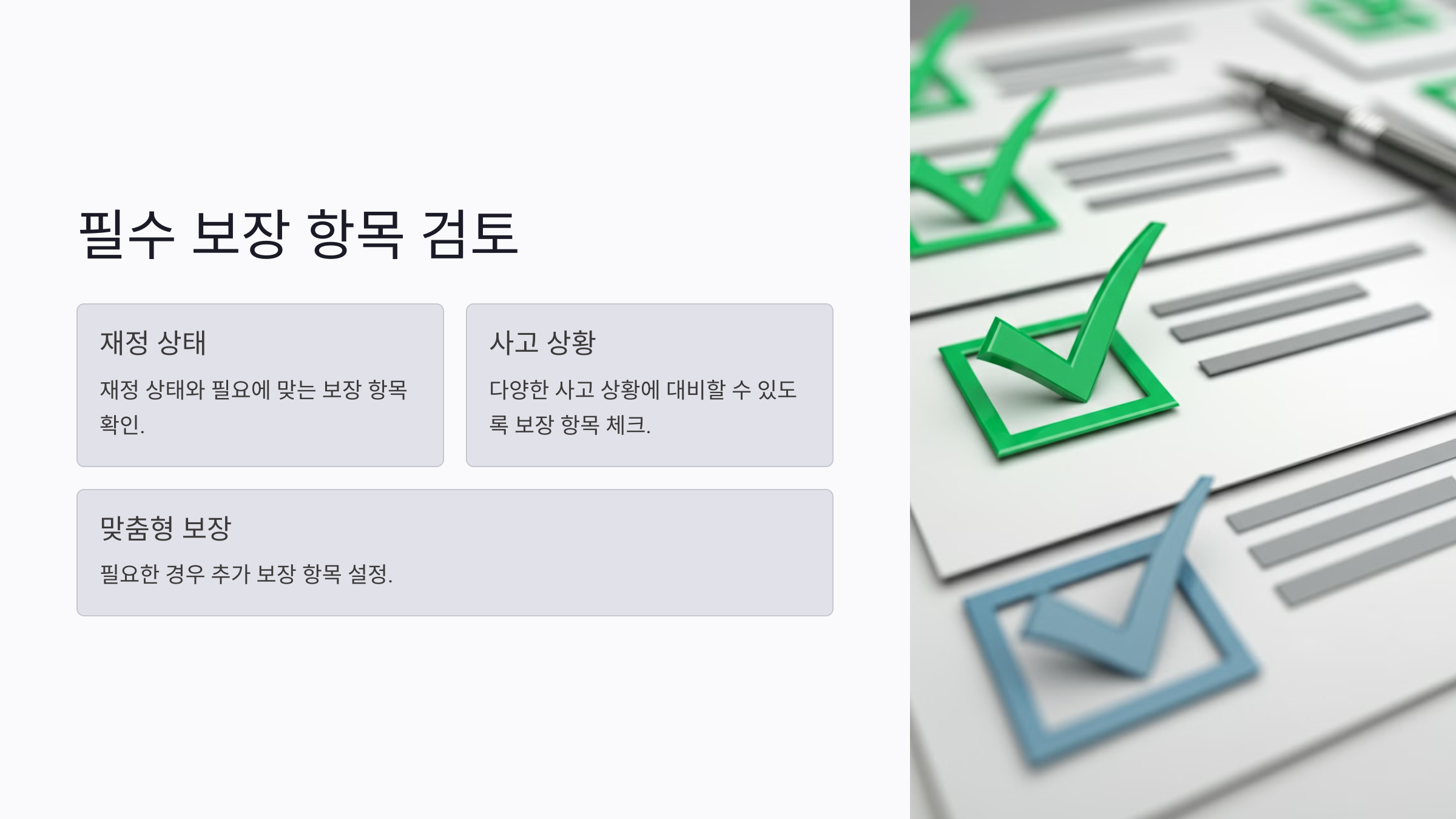FAQ 1: 손해보험 가입 시 필수적으로 검토해야 할 보장 항목은 무엇인가요?