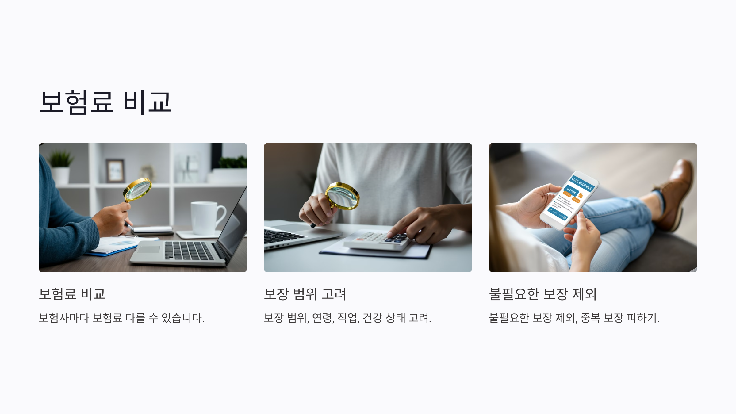 또한, 가입자가 자신의 필요에 가장 적합한 상품을 선택할 수 있도록, 보험료 비교 및 보장 항목 설정 요령을 함께 제공합니다.