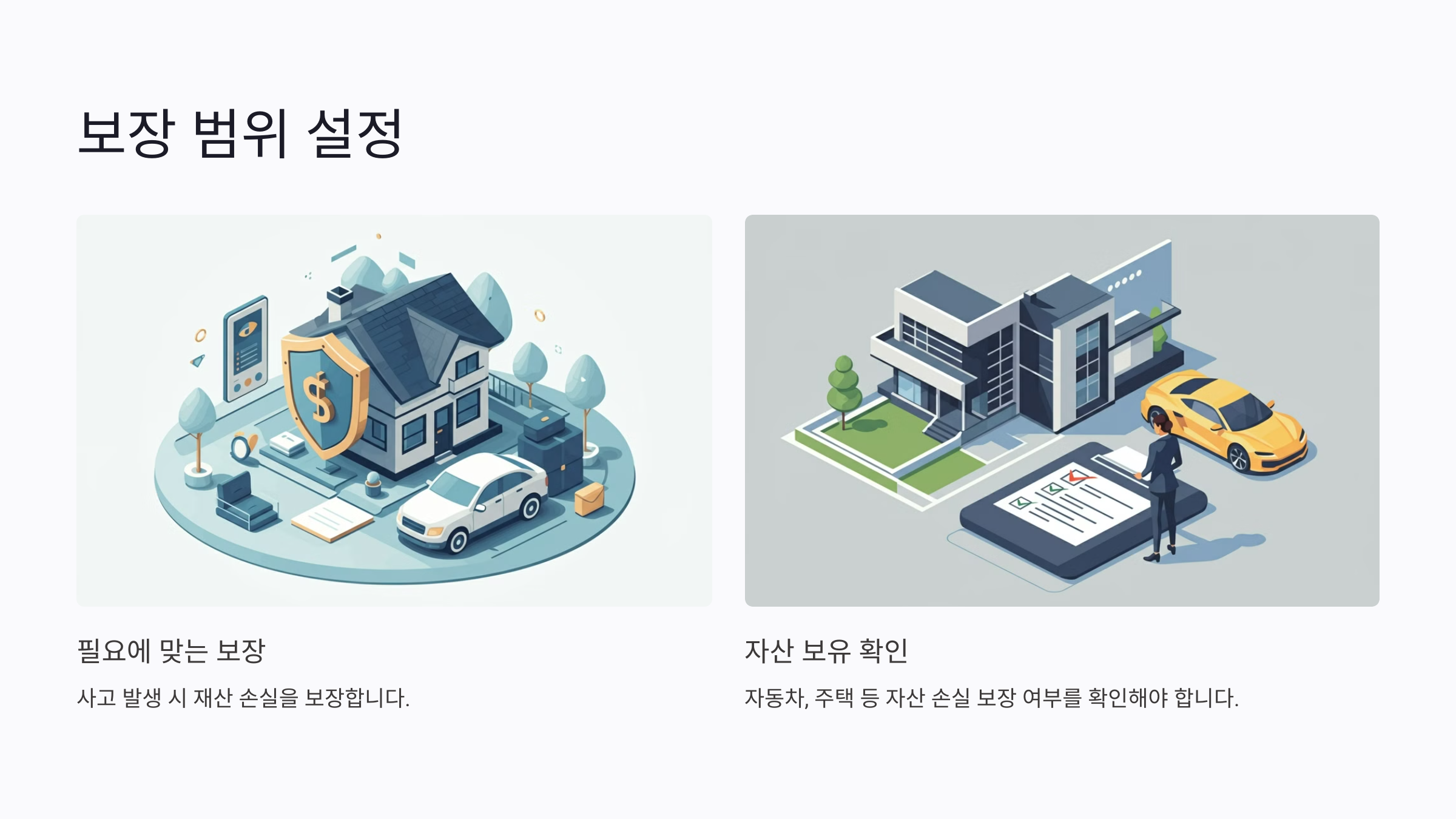 손해보험은 사고 발생 시 재산 손실이나 의료비를 보장해 주므로, 본인의 필요에 맞는 보장 항목을 정확히 설정하는 것이 매우 중요합니다.
