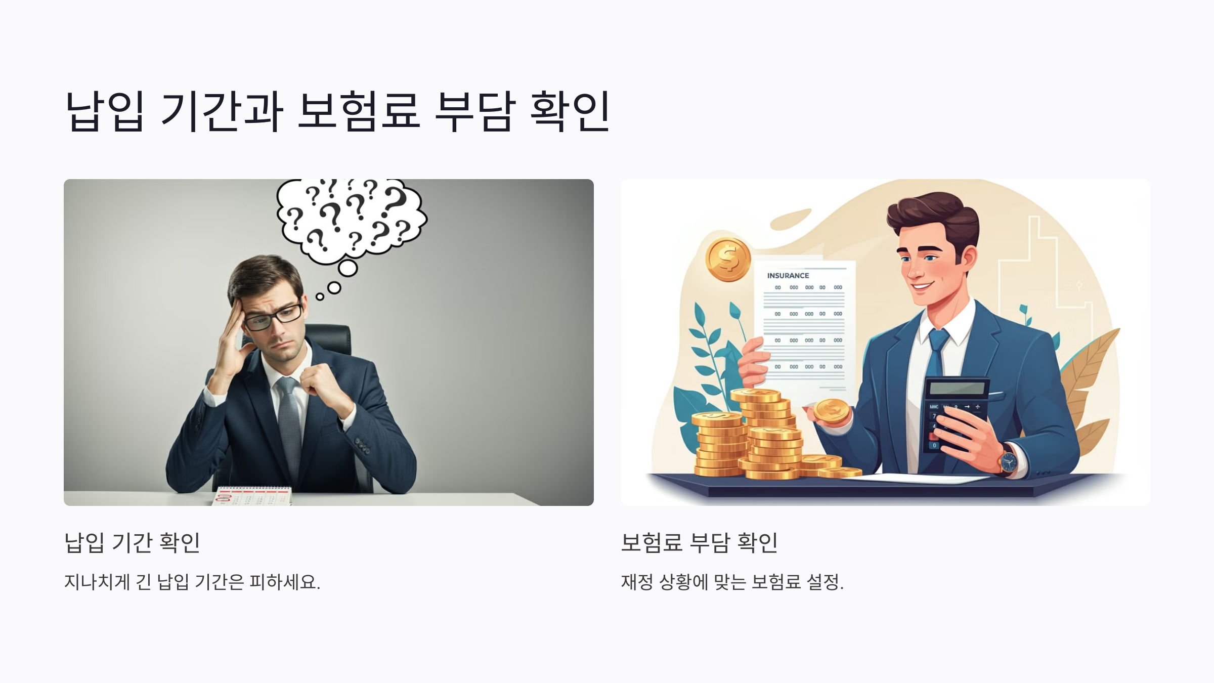 가입하려는 보험의 납입 기간이 지나치게 길지 않은지, 그리고 보험료 부담이 재정 상황에 맞는지 확인하는 것이 중요합니다.