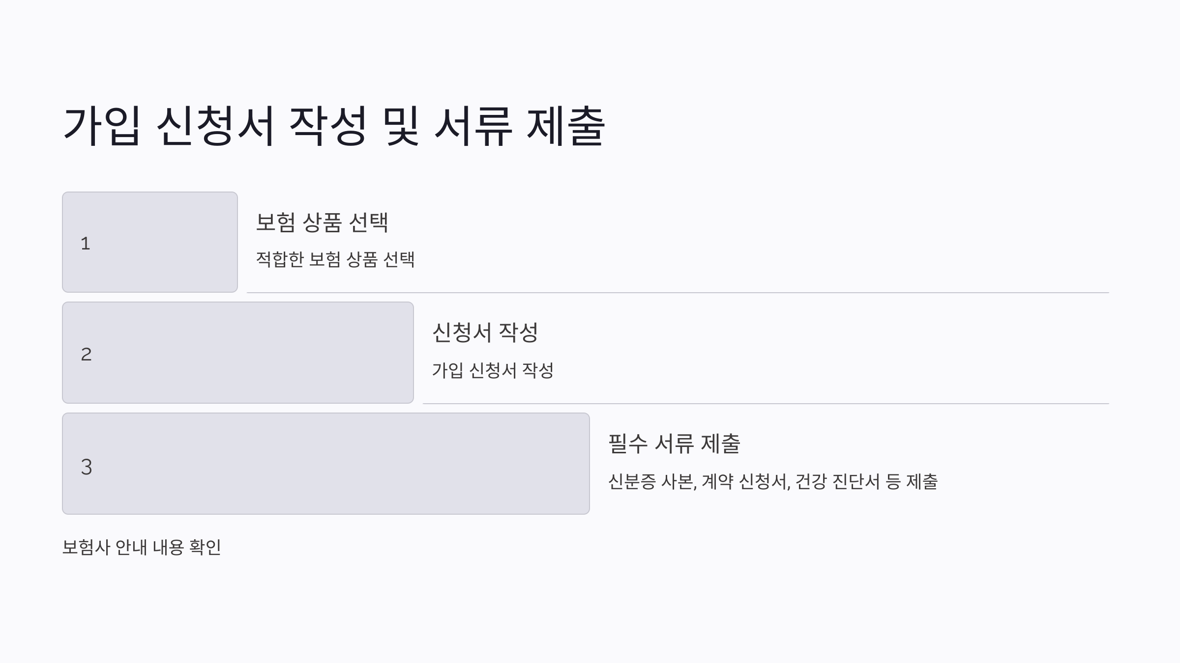 적합한 보험 상품을 선택한 후에는 가입 신청서를 작성하고 필수 서류를 제출하는 절차를 진행해야 합니다.
