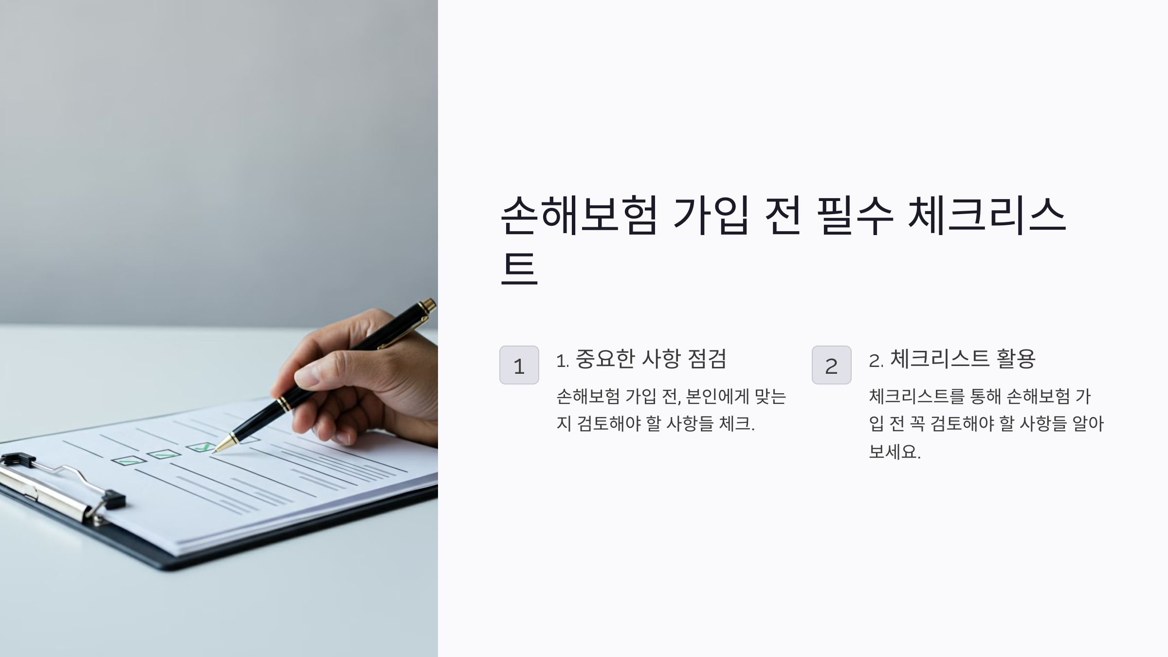 손해보험을 가입하기 전, 본인에게 맞는지 검토해야 할 사항들을 체크리스트 형태로 정리해두는 것이 매우 유용합니다. 아래의 체크리스트를 통해 손해보험 가입 전 꼭 검토해야 할 사항들을 알아보세요.