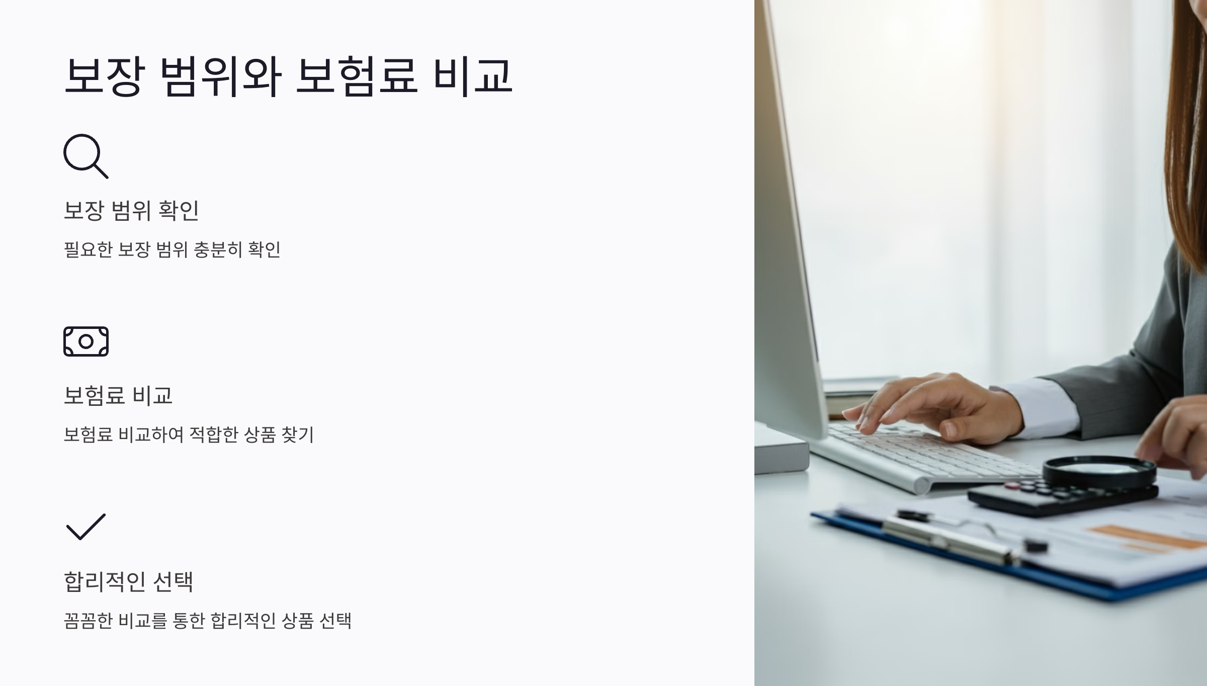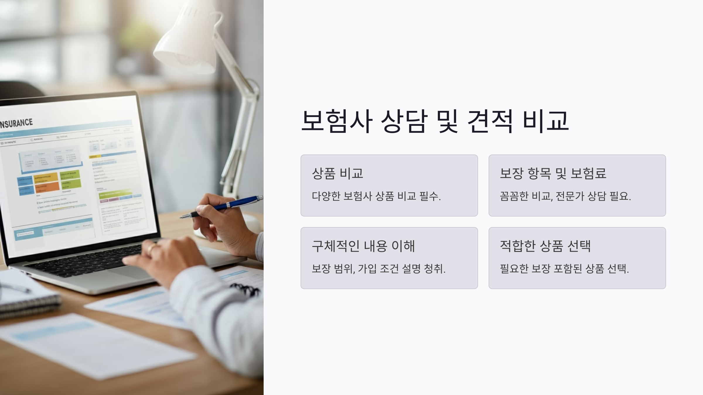 이 과정에서 보장 항목과 보험료를 꼼꼼히 비교하고, 필요한 경우 전문가와 상담을 통해 보험 상품의 구체적인 내용을 이해하는 것이 중요합니다.