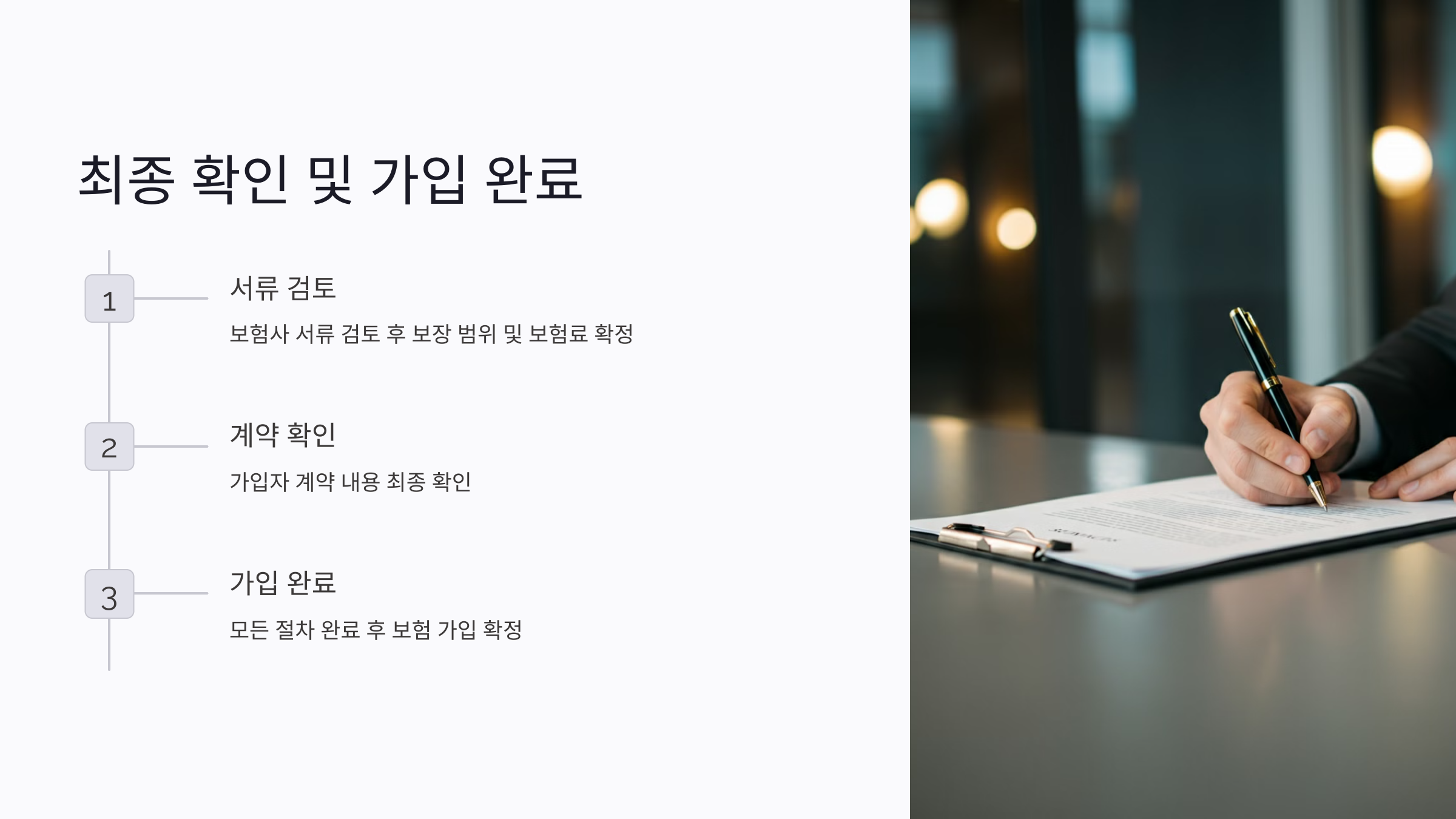 이때 가입자가 계약 내용을 최종 확인하며, 필요에 따라 보장 항목이나 보험료에 대해 다시 상담을 진행할 수 있습니다. 모든 절차가 완료되면 보험 가입이 확정되고, 해당 보험의 보장 혜택이 발효됩니다.