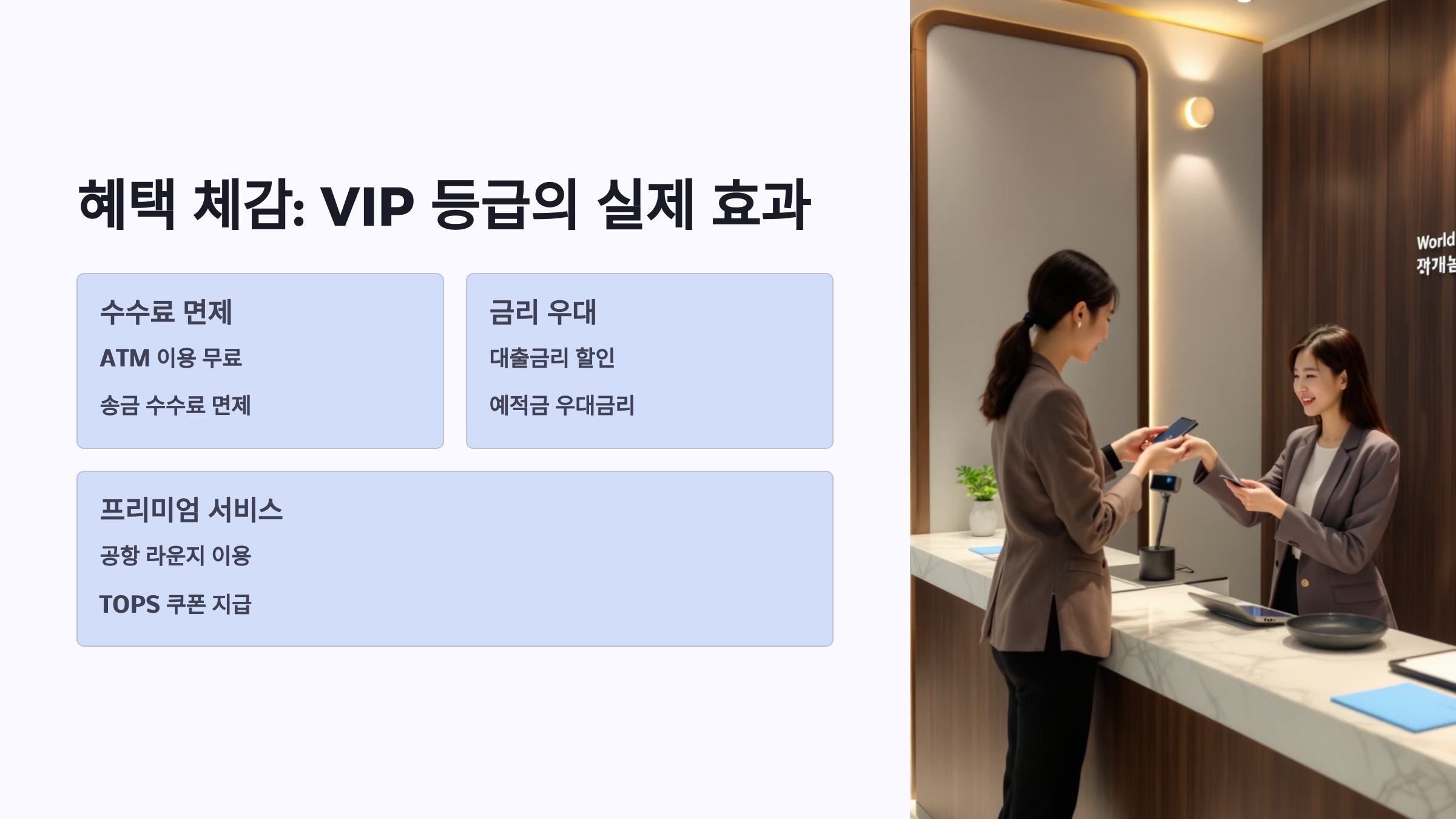 VIP 등급을 달성한 후 가장 먼저 느낀 변화는 수수료 면제 항목의 확대였어요. 신한은행은 타행 이체, 자동이체, ATM 출금 등 월 20회 이상 수수료가 면제됐고, 하나은행은 외화 송금 우대율이 높아졌어요.