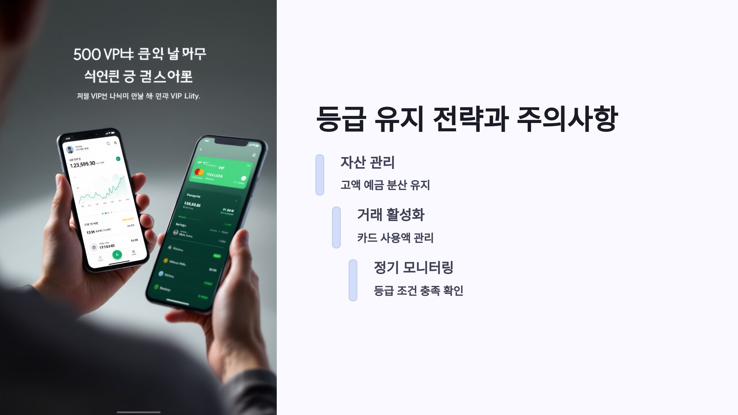 등급을 한 번 올렸다고 끝이 아니에요. 매달 실적을 유지해야 VIP 등급을 유지할 수 있어요. 특히 카드 실적이 빠지면 다음 달에 바로 등급이 내려갈 수 있어요.