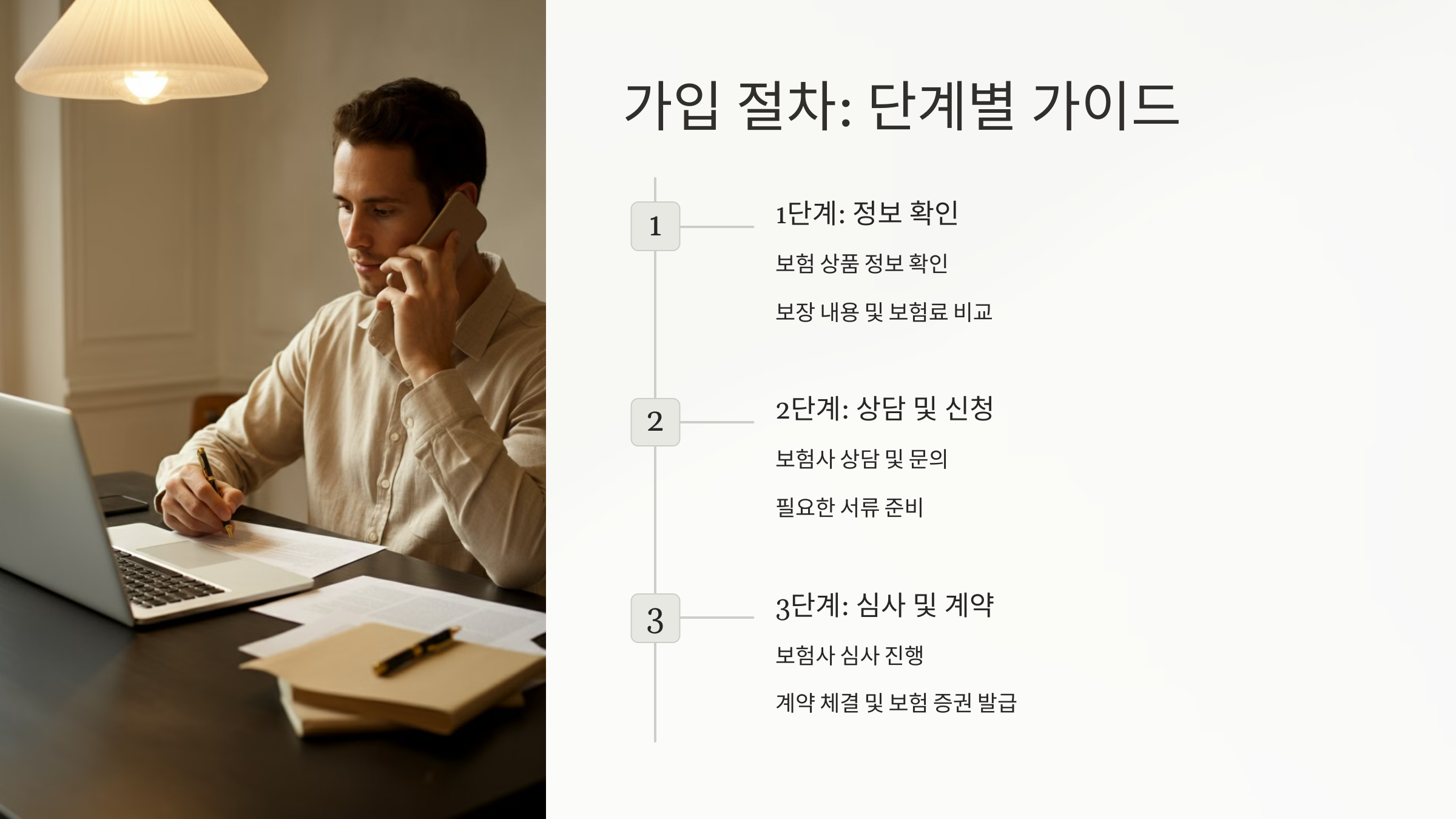 모든 서류를 준비한 후에는 가입 신청서를 작성하여 제출합니다. 이때 보장 항목, 인적 사항, 보험료 관련 정보를 꼼꼼히 기재하고 누락 없이 제출해야 합니다. 정확한 정보 기재는 향후 보험금 청구 과정에서도 문제를 줄이는 중요한 요소입니다.