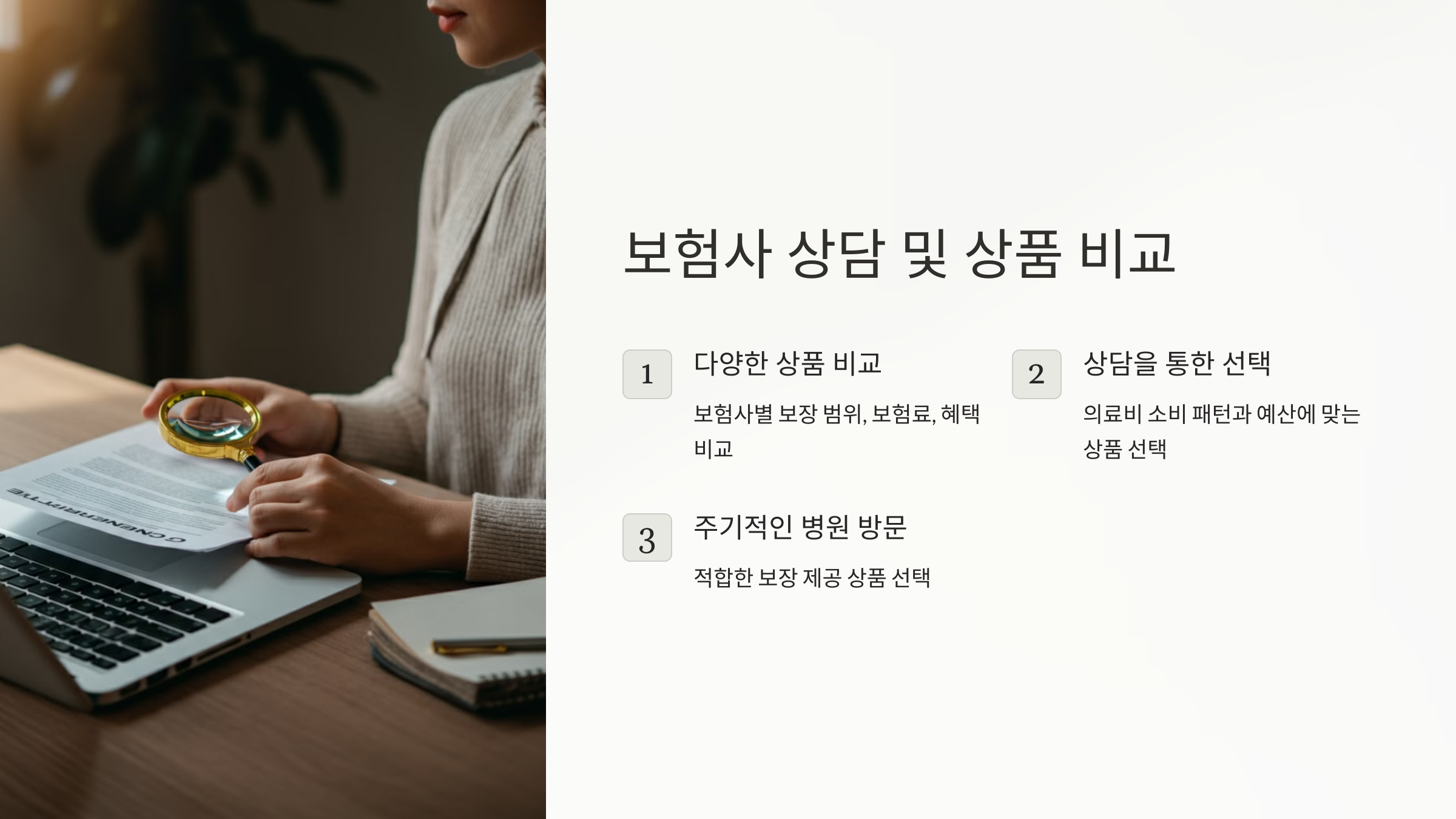 상담을 통해 본인의 의료비 소비 패턴과 예산에 맞는 상품을 선택하는 것이 필수적입니다. 특히 주기적으로 병원을 방문하는 경우, 이에 적합한 보장을 제공하는 상품을 선택하는 것이 유리합니다.