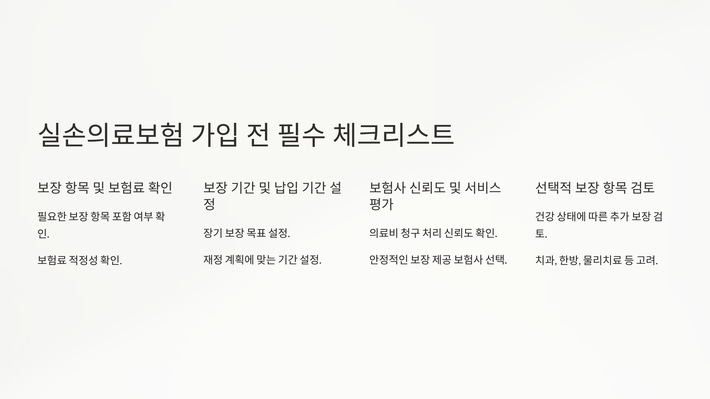 실손의료보험은 장기적인 보장을 위해 가입하는 보험이기 때문에, 가입 전 필수적으로 확인해야 할 중요한 사항들이 있습니다. 아래 체크리스트를 활용하여 자신에게 최적의 실손의료보험을 선택할 수 있도록 하세요.