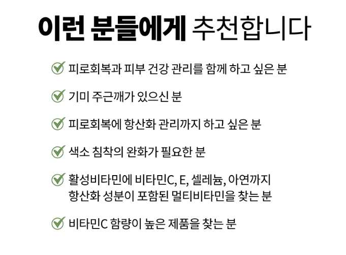 이 제품은 육체적, 정신적 피로를 동시에 해결할 수 있는 종합 비타민제로, 일상 생활에서의 활력을 되찾고자 하는 분들에게 추천됩니다. 가격 대비 성분과 효능을 고려할 때 가성비가 좋은 제품으로 평가받고 있으며, 다양한 상황에서 비타민 보충이 필요한 분들에게 적합합니다.