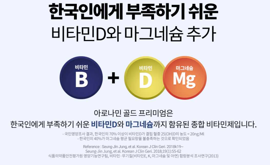 아로나민골드 프리미엄은 다양한 활성형 비타민과 미네랄을 포함하고 있습니다.