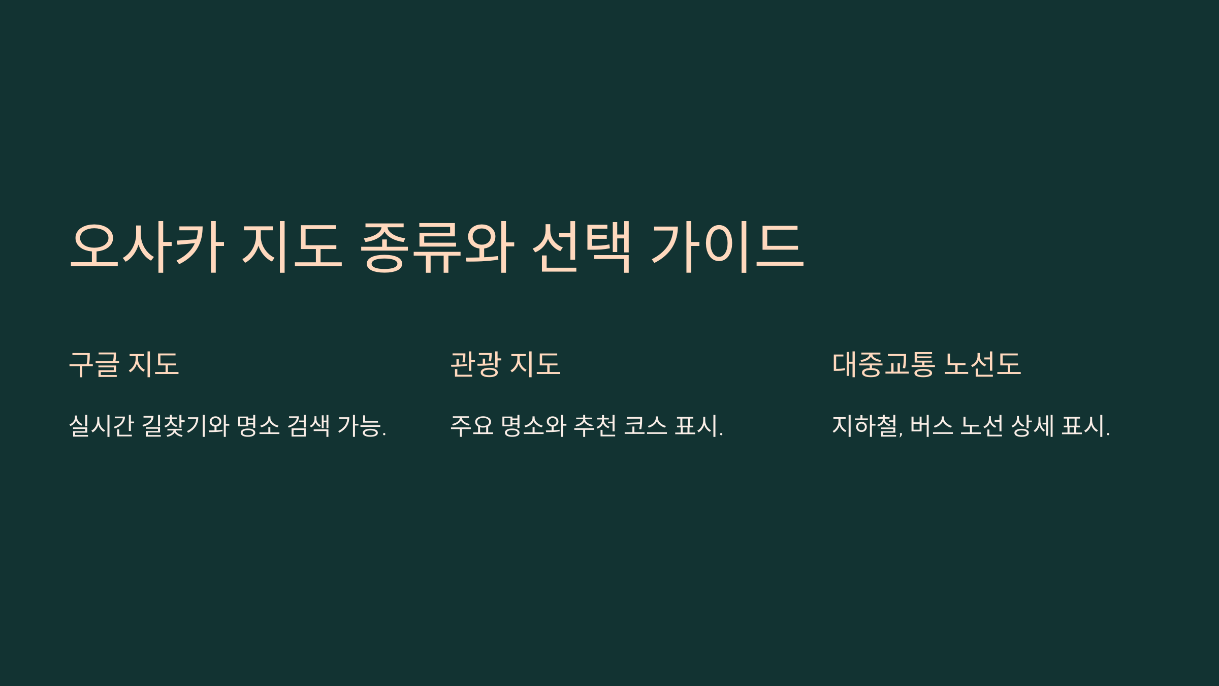 오사카 여행 시 사용 목적에 맞춰 지도를 선택하면 여행이 더욱 수월해집니다. 대표적으로 구글 지도, 관광 지도, 대중교통 노선도가 있으며, 각각의 지도는 다른 여행 필요에 따라 선택할 수 있습니다.