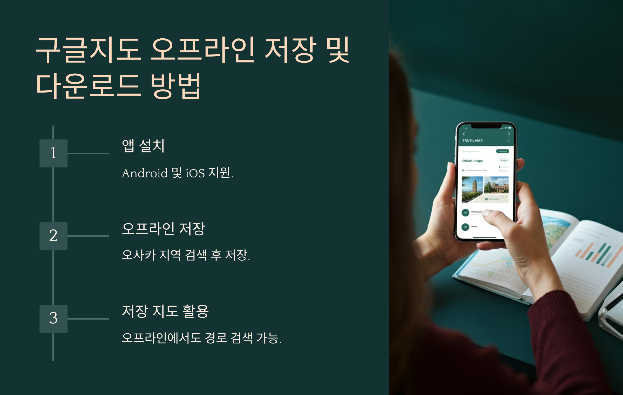 오프라인 지도 저장 방법: 구글 지도 앱을 설치한 후 오사카 지역을 검색하고, 하단에 나타나는 '오프라인 저장' 옵션을 눌러 다운로드를 시작합니다.