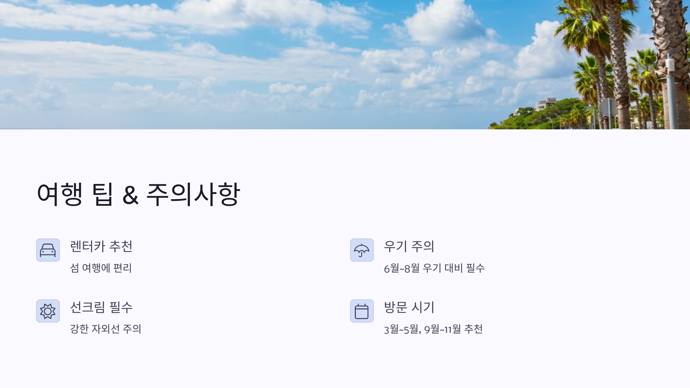 아름다운 해변, 다양한 액티비티, 맛집 투어, 그리고 로맨틱한 드라이브 코스까지 여행 스타일에 따라 맞춤 일정을 구성할 수 있습니다.