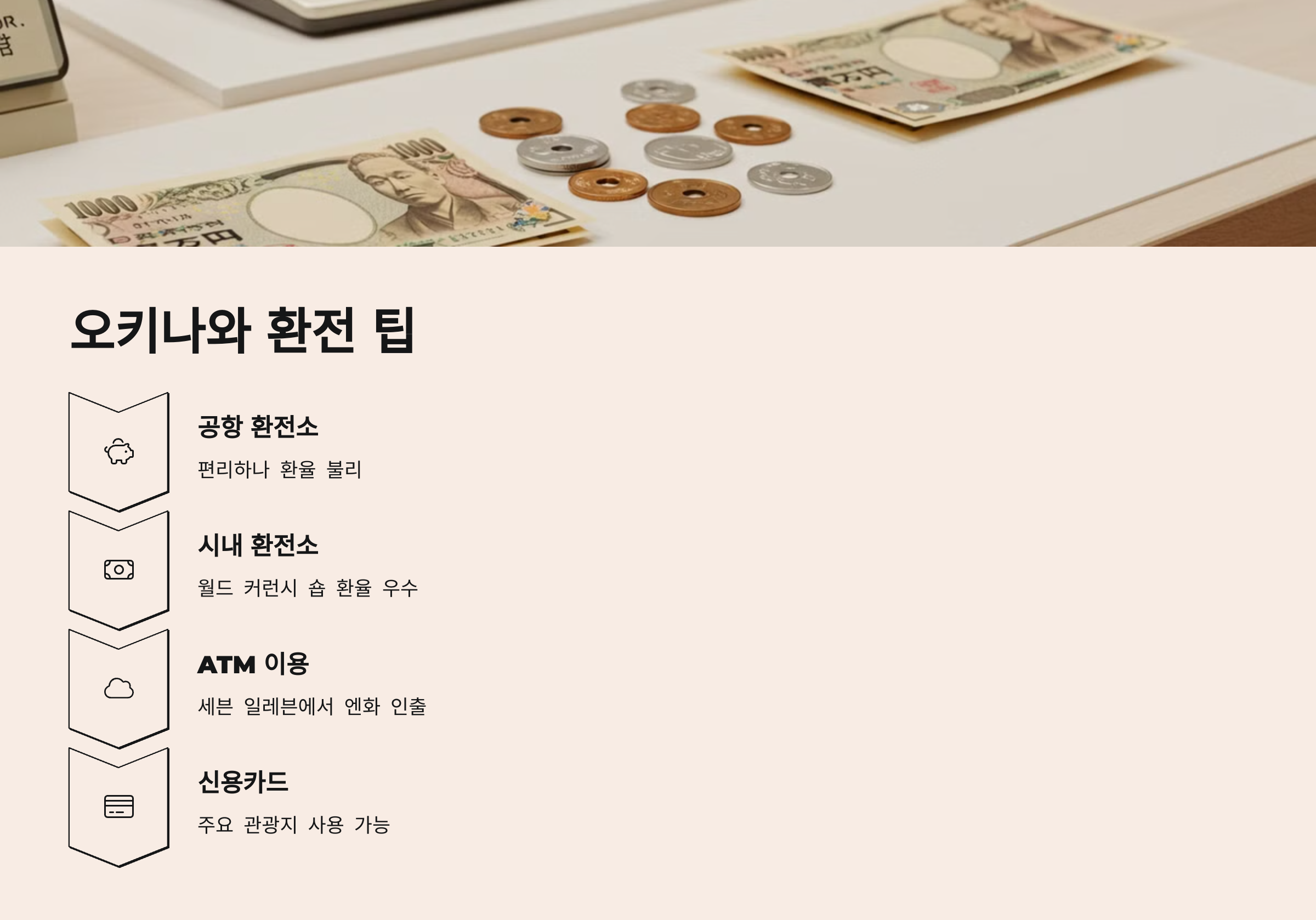 오키나와 여행을 할 때는 일본 엔화가 필요합니다. 공항에서도 환전이 가능하지만, 더 나은 환율을 위해서는 현지 환전소나 국내 은행을 이용하는 것이 좋습니다. 환전을 효율적으로 하는 방법을 소개합니다.