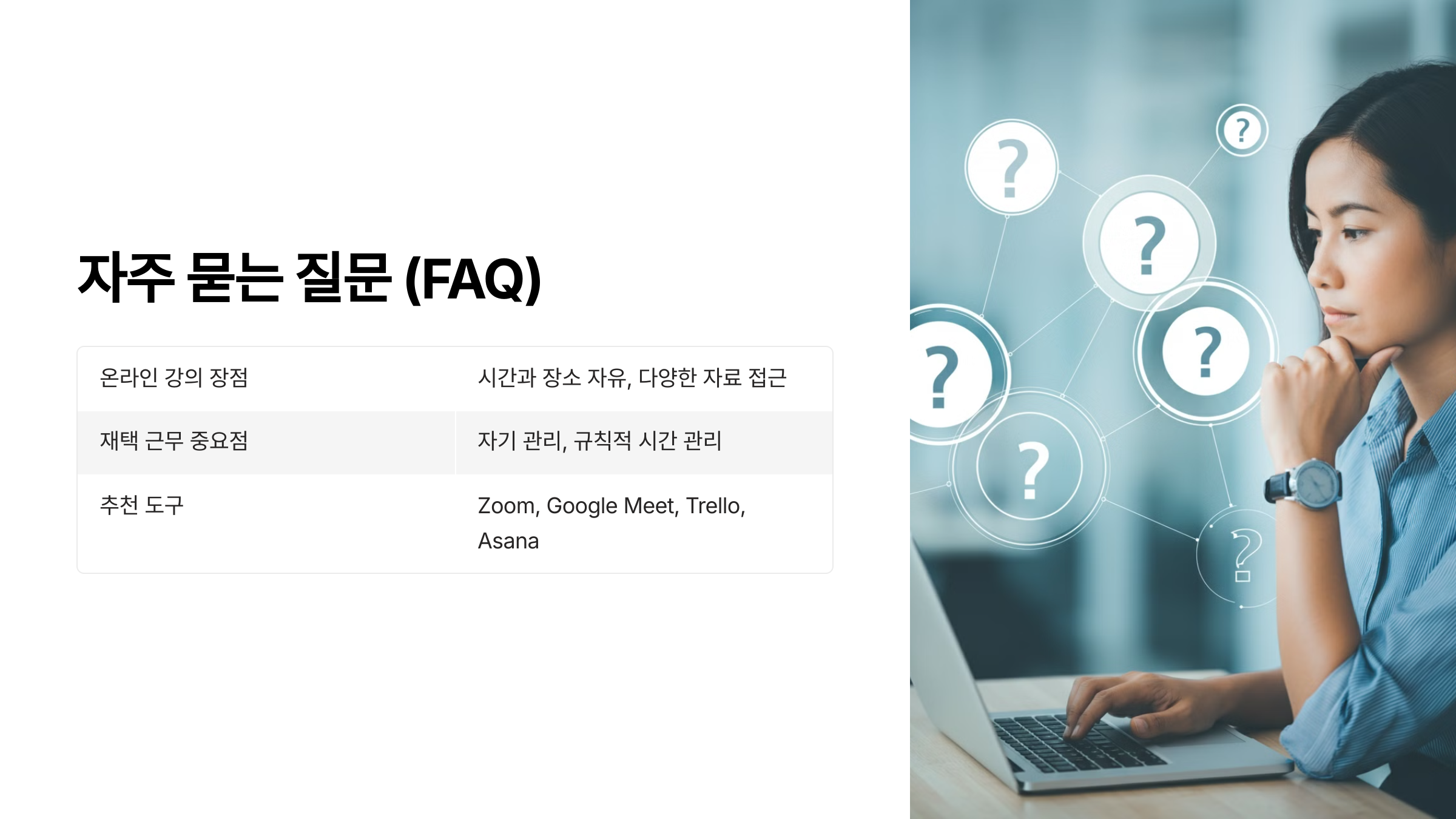 • 자기 관리와 규칙적인 시간 관리가 중요합니다. 명확한 근무 시간 설정과 환경 조정이 필수적입니다.